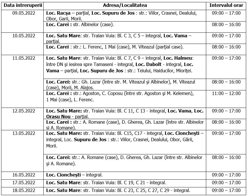 Distribuție Energie Electrică Romania - Satu Mare anunţă întreruperea alimentării cu energie electrică: