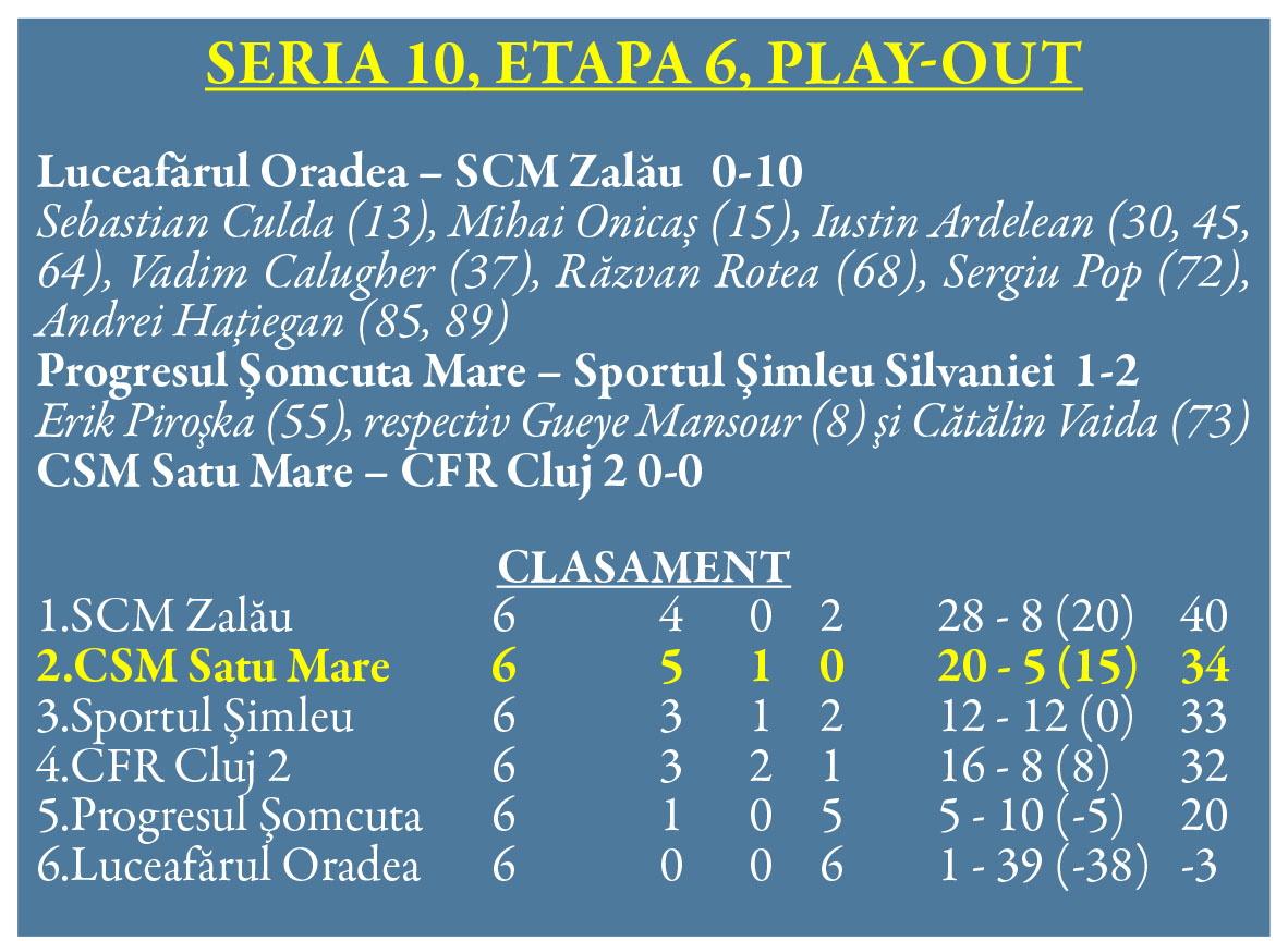 CSM Satu Mare a remizat miercuri cu CFR II Cluj Napoca și rămâne în grafic pentru o clasare finală pe locul doi în play-out.
