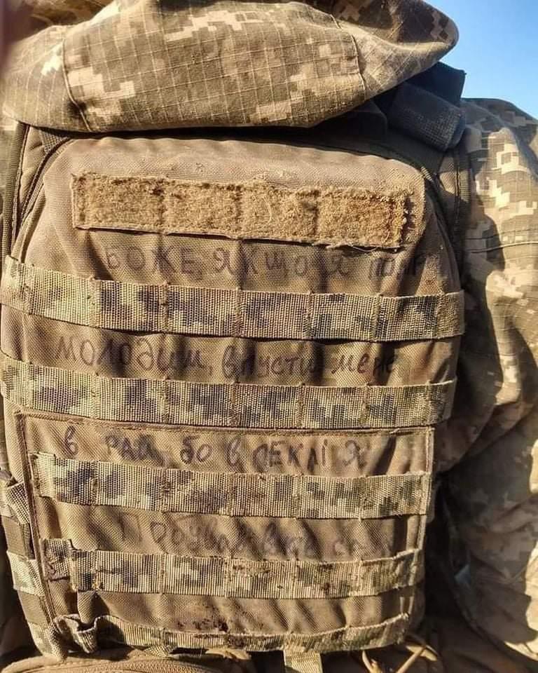 Pe rucsacul de luptă al unui soldat ucrainian stă scris