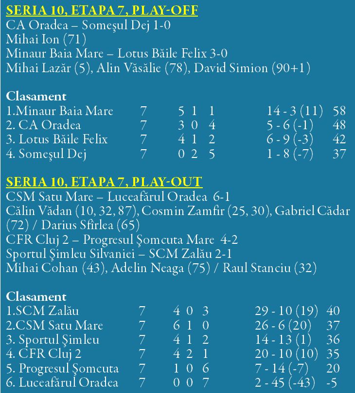 În aceeași etapă, Spotrtul Șimleu, echipa antrenată de sătmăreanul Dacian Nastai a reușit să învingă pe SCM Zalău în derby-ul Sălajului.
