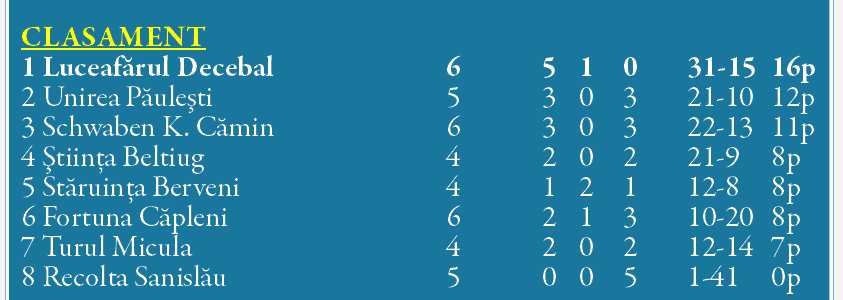 Rezultatele şi clasamentul la zi : LIGA A IV-A ELITE - Play-OUT, Etapa a 6-a Schwaben K. Cămin - Stăruinţa Berveni 3-1 Luceafărul Decebal - Fortuna Căpleni 8-1 Ştiinţa Beltiug - Unirea Păuleşti se joacă vineri, ora 18:00 Turul Micula - Recolta Sanislău se joacă sâmbătă, ora 18:00