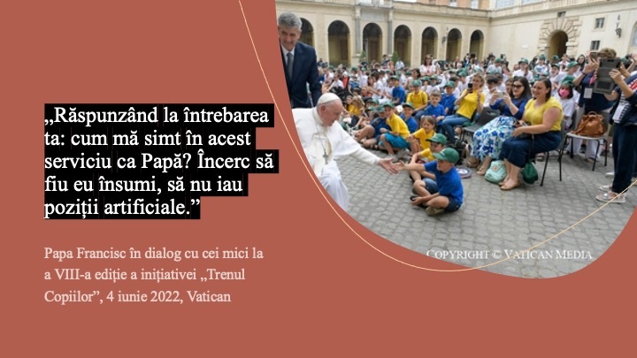 Papa Francisc i-a întâlnit atunci pe micuții participanți la cea de-a opta ediție a inițiativei „Trenul Copiilor”, un eveniment organizat anual de Consiliul Pontifical pentru Cultură, în care cei mici sunt protagoniști. Ei sunt cei care vorbesc cu Sfântul Părinte, îi pun întrebările pe care le poartă în suflet și, uneori, îi sugerează ceva. Cei mai mulți, curioși de felul în care se poate simți cum spun ei „cea mai importantă persoană a lumii” au putut învăța încă o dată de la Papa Francisc că pontificatul său este o slujire pe care o definește în mod autentic drept „responsabilitate de a-i servi pe alții, de a fi de ajutor altora; nu de a fi mai presus de ceilalți sau de a porunci. Aceasta nu.”