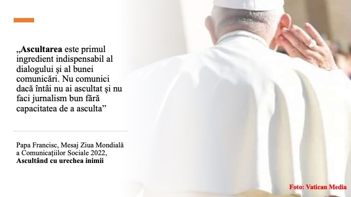 Tema ascultării profunde a fost recent și în centrul celei de a ”Cincizeci și șasea Zi a Comunicațiilor Sociale”, marcată de Biserica Catolică anual în prima duminică după Înălțarea Domnului. Prin această inițiativă propusă de Conciliul Ecumenic Vatican II, Biserica, „simțindu-se intim solidară cu omenirea și istoria ei, intenționează să atragă atenția copiilor ei și a tuturor oamenilor de bunăvoință asupra unui fenomen vast și complex a instrumentelor moderne de comunicare socială (...) care constituie una dintre cele mai caracteristice note ale civilizației actuale” (Fericitul Papă Paul al VI-lea, Prefață la Constituția Pastorală Gaudium et spes, 1967).