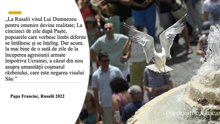 Cu toate acestea, în zi de comemorare a nașterii Bisericii Universale prin Pogorârea Duhului Sfânt, în acest an, Papa Francisc a reînnoit apelul la pace către liderii națiunilor: „Vă rog să nu duceți omenirea în ruină!”, a spus la rugăciunea Regina Caeli din Duminica Rusaliilor din Anno Domini 2022, cerând „să fie ascultat strigătul disperat al oamenilor care suferă – și îl vedem în fiecare zi în mass-media – să fie respectată viața umană și să se oprească distrugerea macabră a orașelor și satelor din estul Ucrainei. Vă rog, pe fiecare, să continuați să vă rugați și să lucrați pentru pace, fără osteneală!”