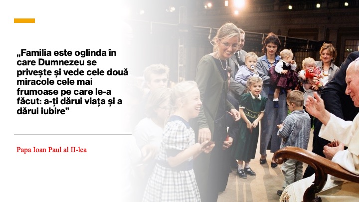 „Fiecare familie poartă o lumină, iar fiecare familie este o lumină! Este o lumină, un far, care trebuie să lumineze calea Bisericii și a lumii în viitor, spre sfârșitul acestui mileniu, și chiar și mai departe, atâta vreme Dumnezeu va îngădui ca această lume să existenţe”... spunea Sf. Papa Ioan Paul al II-lea, pe data de 8 octombrie 1994, în Piața ”Sfântul Petru”, cu prilejul primei Întâlniri Mondiale a Familiilor.