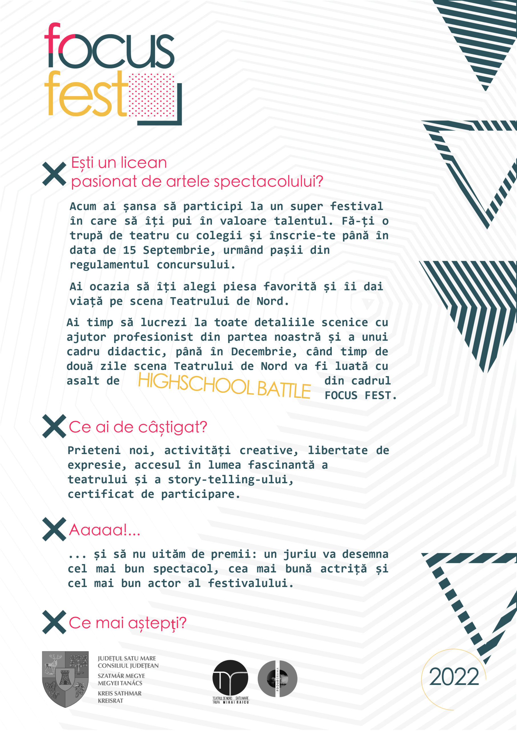 Se pot înscrie la festival trupe de teatru formate din elevi de clasele IX – XII ai tuturor liceelor din Județul Satu Mare.