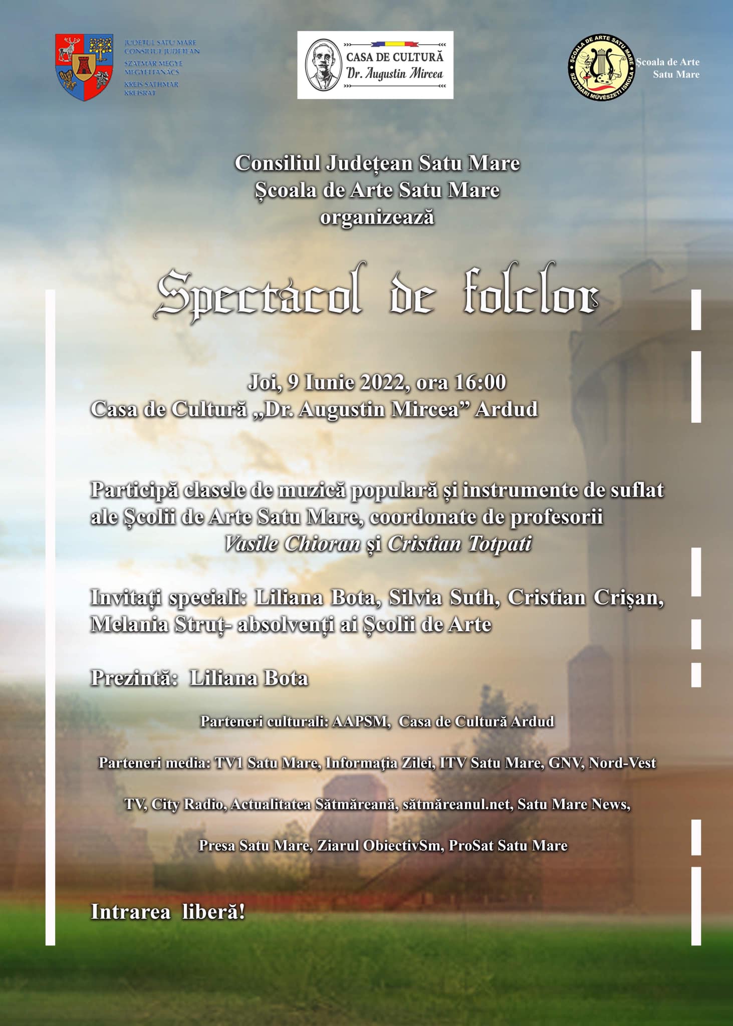 - Joi, 9 iunie 2022, ora 16.00, la Casa de cultură „Augustin Mircea" din Ardud - Spectacolul de folclor al claselor de canto popular, vioară și instrumente de suflat coordonate de prof. Vasile Chioran și prof. Cristian Totpati;