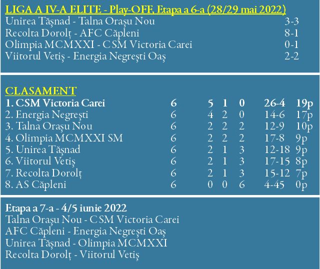 LIGA A IV-A ELITE - Play-OFF, Etapa a 7-a SÂMBĂTĂ, 4 iunie, următoarele meciuri: ORA 18:00 - seniorii: Unirea Tăşnad - Olimpia MCMXXI Recolta Dorolţ - Viitorul Vetiş DUMINICĂ, 5 iunie, următoarele meciuri: ORA 17:00 - seniorii: Talna Oraşu Nou - CSM Victoria Carei AFC Căpleni - Energia Negreşti Oaş
