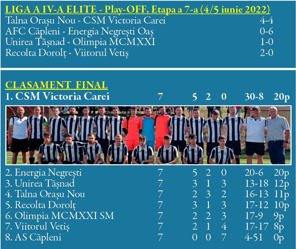 Duelul Victoriilor cam așa se arată a fi barajul de promovare în liga a 3-a ce va opune campioanele județelor Satu Mare și Cluj.Careienii au câștigat cu mari emoții liga a 4-a elite după un final plin de suspans . Trupa lui Marius Botan a profitat de remiza Oașului din penultima etapă de la Vetiș și în ultima rundă a obținut la Orașu Nou punctul care i-a asigurat un nou titlu... Meciul de la Orașu Nou a fost unul plin de suspans cu gazdele care au condus cu 3-0 în minutul 15 și cu o revenire a careienilor la 3-3 până la pauză. Cu un penalty repetat pentru Victoria după ce portarul gazdelor s-ar fi mișcat înaintea execuției și apoi cu un nou gol al Talnei în partea a doua pentru 4-3. S-a terminat 4-4 până la urmă cu reușita căpitanului Tillinger . Cum Oașul a câștigat cu doar 6-0 la Căpleni , oșenii având nevoie de un succes la peste 13 goluri, careienii au deschis șampania la finalul meciului de la Orașu Nou și așteaptă acum dubla din barajul cu Victoria Cluj.