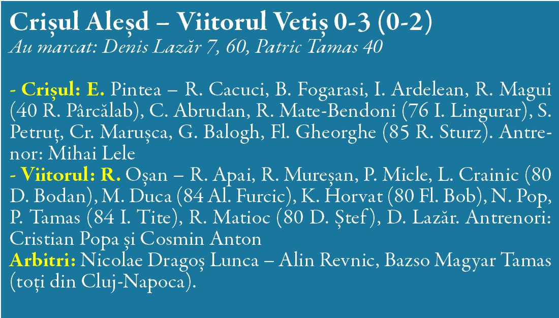 Cu circa 400 de spectatori în tribună și pe un gazon excelent, trupa antrenată de Cristi Popa a început excelent jocul. Viitorul Vetiș a deschis scorul în minutul 7, când Denis Lazăr a punctat cu o frumoasă lovitură de cap din centrarea lui Raul Matioc, astfel că sătmărenii au pus stăpănire pe joc. Cu o posesie superioară și o omogenitate evidentă, Viitorul și-a creat și ocazii de a marca iar în minutul 20 Pintea a respins șutul din 14 metri expediat de D. Lazăr. Superioritatea oaspeților s-a soldat cu golul de 0-2, Patric Tamas învingându-l pe Pintea cu un șut plasat la colțul lung în minutul 40. Lazăr și Matioc au fost aproape de golul 3 în minutul 50, dar Pintea a reușis să blocheze de două ori în aceeași fază. Chiar dacă în partea a doua jocul Crișului a arătat mai bine, cei care au înscris au fost tot sătmărenii: Matioc a trimis o pasă pe culoar, Lazăr (un atacant cu un fizic plăcut și calități aferente postului) a scăpat singur și a plasat balonul pe lângă portar (0-3). Crișul a fost aproape de golul de onoare, dar Oșan a respins de sub transversală șutul de la marginea careului expediat de S. Petruț. A rămas 0-3, iar Viitorul BVetiș are clar prima șansă de calificare la turneul semifinal . Viitorul Vetiș este alcătuită dintr-o grupă care a trecut pe la Olimpia Satu Mare și LPS Satu Mare, pregătită de Cristian Popa de la constituirea ei. Meciul retur este programat vineri, 10 iunie, de la ora 18:00, pe Stadionul Someșul din Satu Mare.