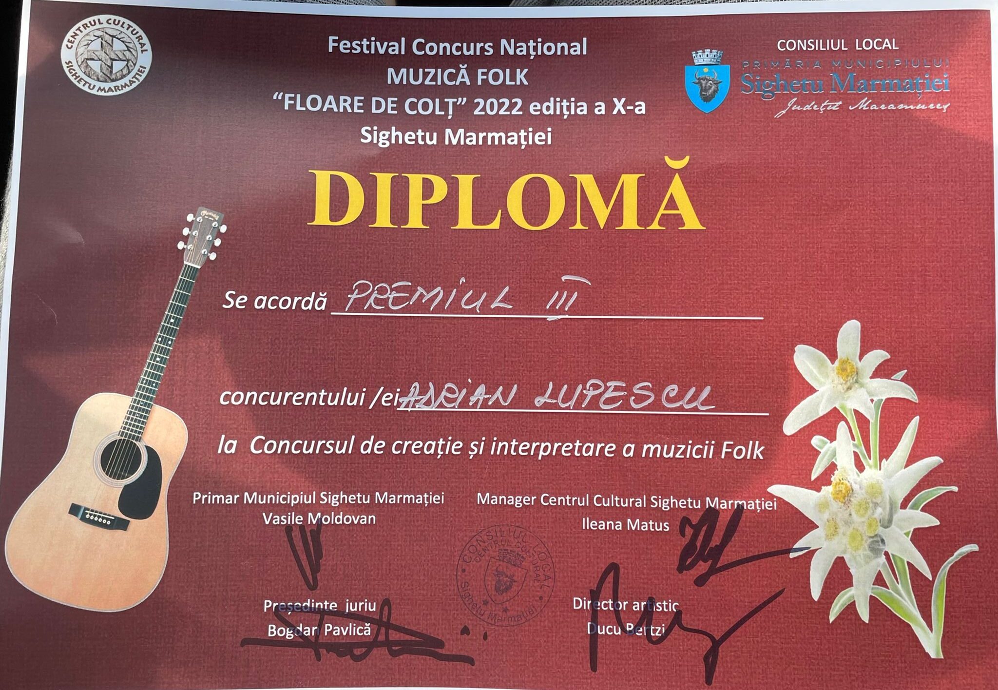 Ajuns la cea de a X – a ediție Festivalul Național de Muzică Folk ,,Floare de colț” s-a desfășurat în perioada 20 – 21 august 2022, la Sighetu Marmației, ce a reunit pe scena concursului cei mai buni zece concurenți din întreaga țară, cei care au trecut de faza de preselecție. Printre aceștia se numără și cantautorul sătmărean Adrian Lupescu care a câștigat premiul III, cu melodia proprie. ”Și bate clopotul din nou la Apa”, dedicată marelui erou al neamului nostru, Vasile Lucaciu. Festivalul este organizat de către celebrul folkist Ducu Bertzi, originar din Maramureș.
