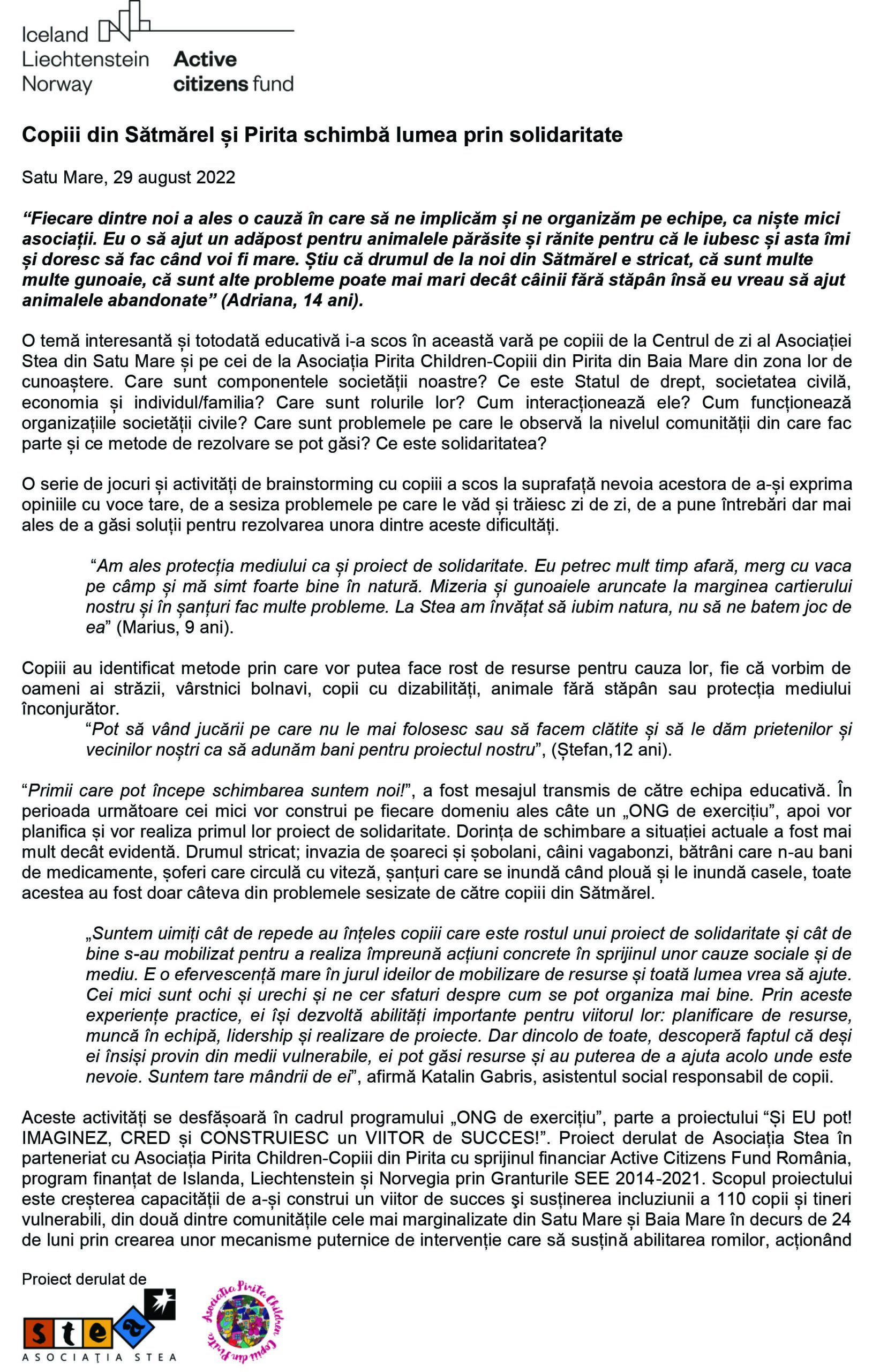 Copiii din Sătmărel și Pirita schimbă lumea prin solidaritate Locale • 22.08.2022 00:00 ||||||| Distribuie: Primește ziarul gratuit pe email! Abonează-te și citești ziarul Gazeta Nord-Vest zilnic, gratuit. Abonează-te Acasa Locale Copiii din Sătmărel și Pirita schimbă lumea prin s... Articole Similare Locale Complexul de Educație Ecologică „Casa verde” din Grădina Romei, a fost gazda festivității de lansare a unui nou proiect de mediu cu titlul: GRĂDINIȚE SALVATOARE DE RÂURI acum 9 ore Locale Viceprimarul Cristina Tămășan Ilieș felicită Poliția Locală. Acțiuni intensificate împotriva cerșetoriei în Satu Mare acum 10 ore Locale Peste 10.000 de cărți electronice de identitate emise în Satu Mare. Viceprimarul Raul Băbțan: „Digitalizarea devine realitate” acum 10 ore Locale Deputatul Mircea Govor: Bugetul României a fost adoptat. Investiții importante pentru județul Satu Mare acum 10 ore Locale Cea mai mare creșă din Satu Mare, aproape de finalizare: 110 locuri pentru copii acum 10 ore Locale Deratizare în Satu Mare, în perioada 23–27 martie 2026. Avertisment pentru populație acum 10 ore Ultimele Articole Locale APASERV. Grupa Albinuțelor de la Grădinița 14 Mai a descoperit drumul apei acum 11 ore Locale Activități dedicate Zilei Mondiale a Apei. Concurs de desen, experimente și lecții despre natură pentru elevii din Medieșu Aurit acum 14 ore Locale Campania APIA 2026 – clarificări privind eliberarea adeverințelor necesare fermierilor pentru obținerea subvențiilor acum 15 ore Locale Acțiune de amploare a polițiștilor în Ardud și Beltiug: amenzi de peste 57.000 de lei și lemn confiscat acum 15 ore Locale Împreună hrănim speranța: Federația Băncilor pentru Alimente dă startul celei de-a 14-a ediții a Colectei Naționale de Alimente în Lidl, PENNY, Auchan, Kaufland și Profi acum 15 ore Locale „Maratonul poveștilor”, la Biblioteca Județeană Satu Mare, de Ziua Internațională a Cărții pentru Copii și Tineret acum 17 ore Cele mai citite 1 Complexul de Educație Ecologică „Casa verde” din Grădina Romei, a fost gazda festivității de lansare a unui nou proiect de mediu cu titlul: GRĂDINIȚE SALVATOARE DE RÂURI 2 NORD VEST TV. Slăbitul cu injecții, între speranță și risc. Avertismentul unui medic gastroenterolog din Satu Mare 3 Cea mai mare creșă din Satu Mare, aproape de finalizare: 110 locuri pentru copii 4 APASERV. Grupa Albinuțelor de la Grădinița 14 Mai a descoperit drumul apei 5 Viceprimarul Cristina Tămășan Ilieș felicită Poliția Locală. Acțiuni intensificate împotriva cerșetoriei în Satu Mare Din aceeasi categorie Complexul de Educație Ecologică „Casa verde” din Grădina Romei, a fost gazda festivității de lansare a unui nou proiect de mediu cu titlul: GRĂDINIȚE SALVATOARE DE RÂURI acum 9 ore Viceprimarul Cristina Tămășan Ilieș felicită Poliția Locală. Acțiuni intensificate împotriva cerșetoriei în Satu Mare acum 10 ore Peste 10.000 de cărți electronice de identitate emise în Satu Mare. Viceprimarul Raul Băbțan: „Digitalizarea devine realitate” acum 10 ore Deputatul Mircea Govor: Bugetul României a fost adoptat. Investiții importante pentru județul Satu Mare acum 10 ore Cea mai mare creșă din Satu Mare, aproape de finalizare: 110 locuri pentru copii acum 10 ore Ultimele stiri Complexul de Educație Ecologică „Casa verde” din Grădina Romei, a fost gazda festivității de lansare a unui nou proiect de mediu cu titlul: GRĂDINIȚE SALVATOARE DE RÂURI acum 9 ore Viceprimarul Cristina Tămășan Ilieș felicită Poliția Locală. Acțiuni intensificate împotriva cerșetoriei în Satu Mare acum 10 ore Peste 10.000 de cărți electronice de identitate emise în Satu Mare. Viceprimarul Raul Băbțan: „Digitalizarea devine realitate” acum 10 ore Deputatul Mircea Govor: Bugetul României a fost adoptat. Investiții importante pentru județul Satu Mare acum 10 ore Cea mai mare creșă din Satu Mare, aproape de finalizare: 110 locuri pentru copii acum 10 ore