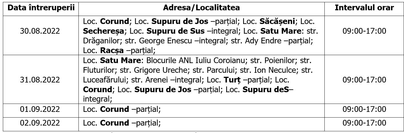 Ne cerem scuze pentru neplăcerile cauzate de aceste întreruperi, care sunt însă necesare pentru asigurarea unei bune funcţionări a instalaţiilor.