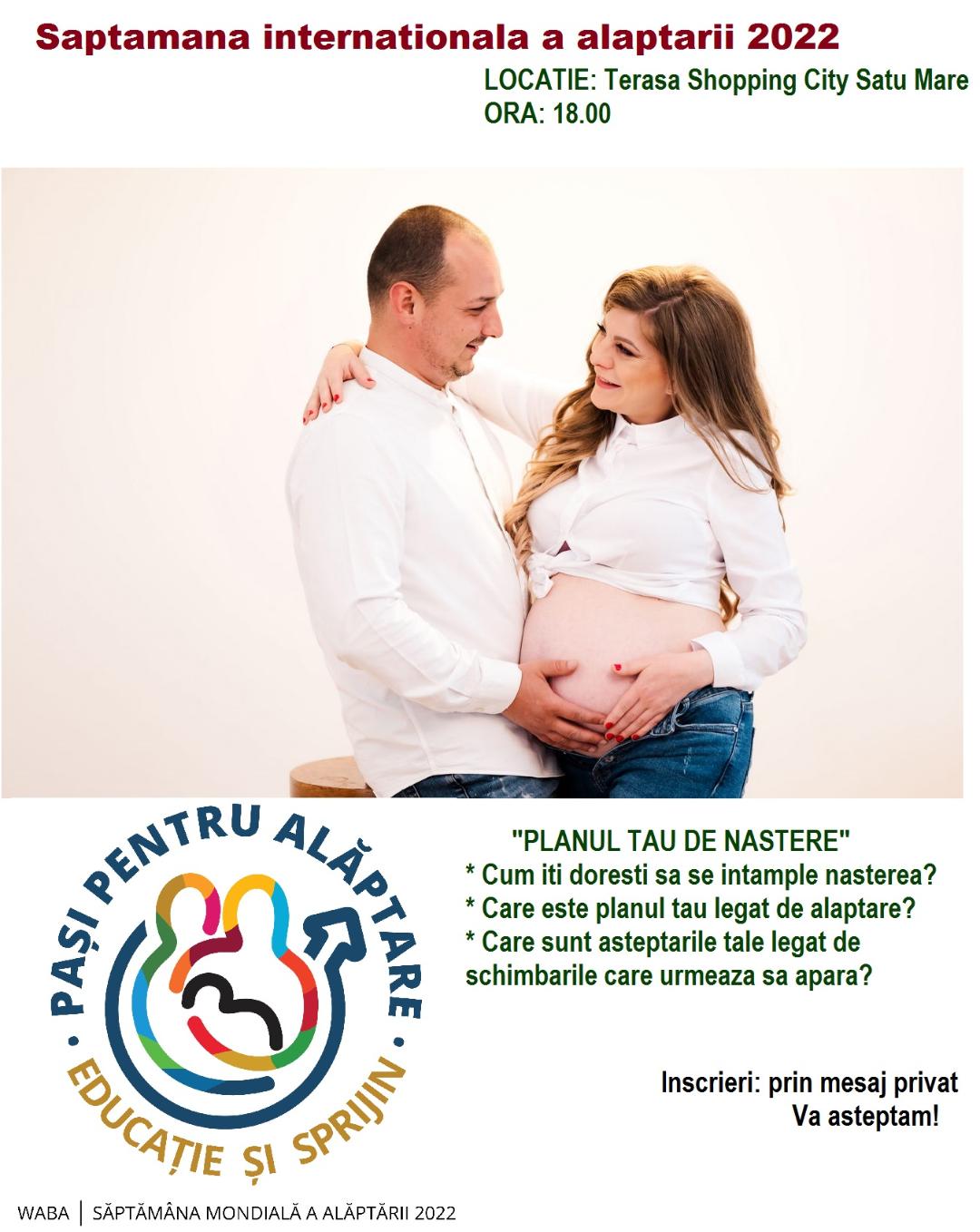 Ca reprezentanți ai Spitalului Judetean Satu Mare doamna Dr. Roxana Varga, medic sef sectie Neonatologie își propune sa marcheze “Săptămâna Internațională a Alăptării 2022” impreuna cu echipa de administratori a grupului “Sprijin in alaptare Satu Mare” si avand-o ca invitat pe asistenta sefa a sectiei de Obstetrica, moasa Paula Cosma pentru un indemn la comunicare, informare, suport si incurajare a alaptarii. Intalnirea din acest an “Planul tau de nastere” va avea loc vineri 5 august ora 18, pe terasa Shopping City Satu Mare.