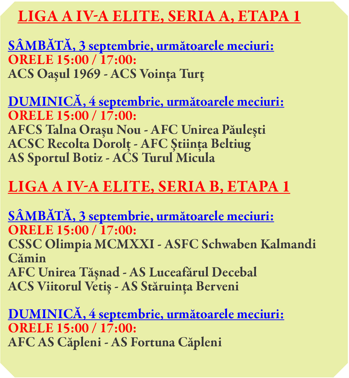 După ce în weekend-ul ce a trecut am avut câteva meciuri jucate în Liga a 4-a, iată că acum în primul sfârșit de săptămână din septembrie pornește la drum și cel mai important campionat organizat de AJF Satu Mare.