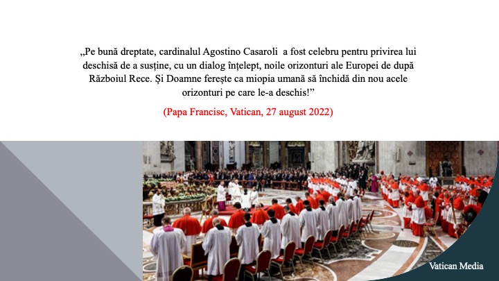 Îndemnându-i să nu-și piardă niciodată stupoarea credinței, pe care o consideră Cale de mântuire, Papa Francisc îl citează în omilia de deschidere a Consistoriului pe cardinalul Agostino Casaroli (fost Secretar de Stat al Vaticanului în perioada 1979-1990), iar cuvintele Excelenței Sale vin pentru a oferi un mesaj clar liderilor lumii despre războiul din Ucraina și tensiunile actuale din Asia. (https://www.vatican.va/content/francesco/it/homilies/2022/documents/20220827-omelia-concistoro.html)