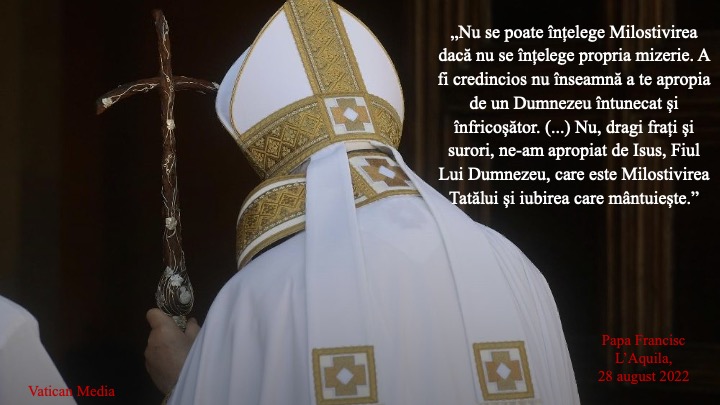 „Frați și surori, fie ca L’Aquila să fie cu adevărat capitala iertării, capitala păcii și a reconcilierii! Acest oraș să poată oferi tuturor acea transformare pe care Maria o cântă în Magnificat: „Pe cei puternici i-a doborât de pe tronurile lor, pe cei smeriți i-a înălțat” (Lc 1,52); cea pe care ne-a amintit-o Isus în Evanghelie, prin: «Cine se înalță pe sine se va smeri, și cine se smerește pe sine se va înălța» (Lc 14,11). Și Mariei, venerată aici cu titlul de Salvatoare a creștinilor, vrem să-i încredințăm propunerea de a trăi potrivit Evangheliei. Fie ca mijlocirea ei maternă să obțină iertare și pace pentru întreaga lume, conștientizarea propriei mizerii și frumusețea Milostivirii.”