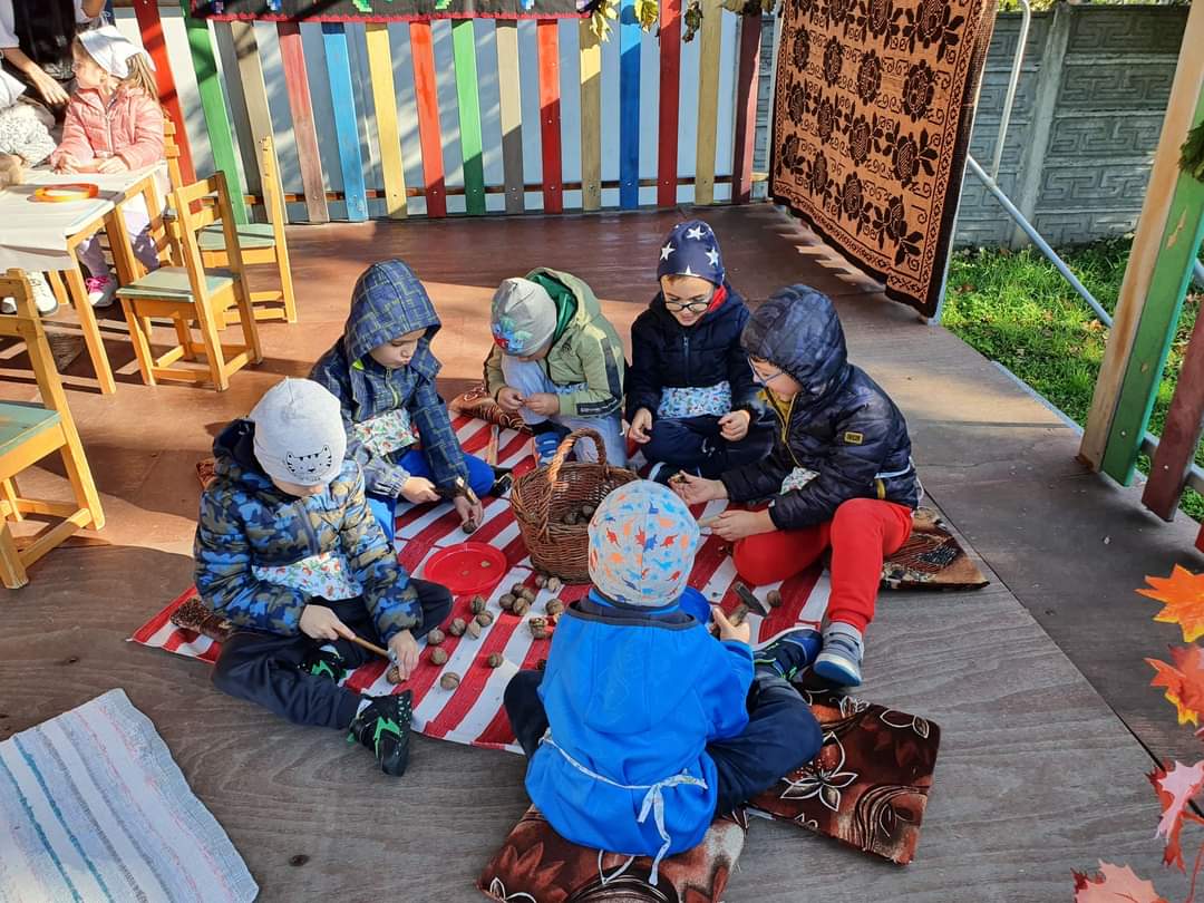 Grupa mijlocie, grupa Zâmbăreților ne-au înveselit ziua cu jocurile lor distractive cu fructe și legume, ne-au bucurat privirile cu un covor de frunze ruginii, au desfăcut porumbul, au curățat și sortat alune și nuci, iar frigăruile din fructe i-au îndulcit pe toți.