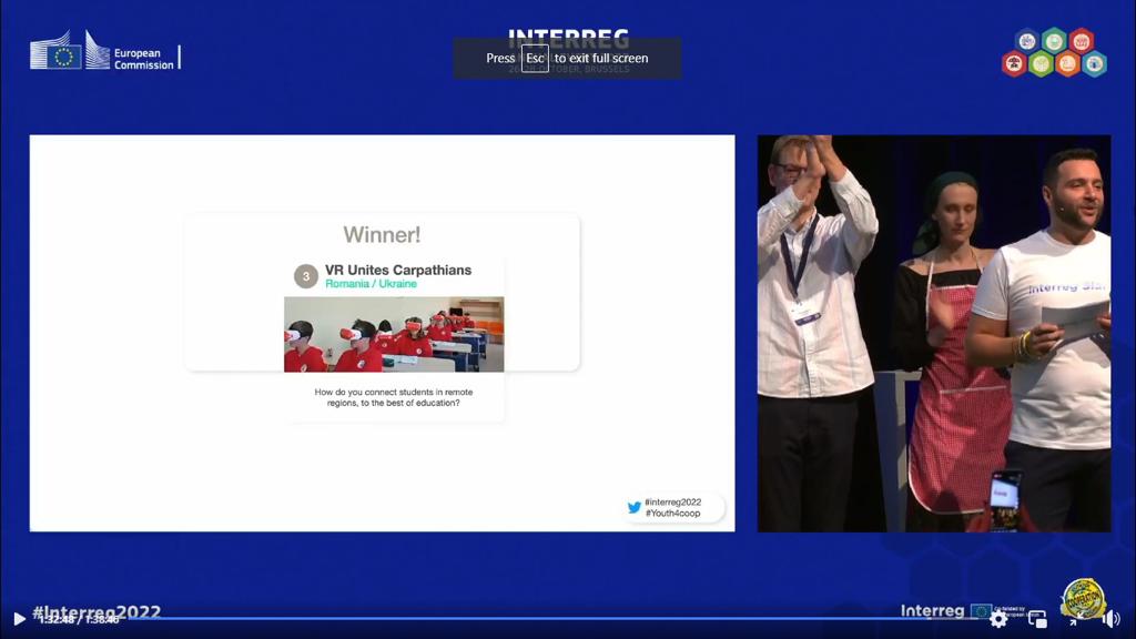 Joi, 27 octombrie a.c. s-a desfășurat la Bruxelles Gala Finală a Concursului de Proiecte Transfrontaliere europene ” INTERREG” din cadrul ”INERREG ANNUAL EVENT 2022”, eveniment la care au participat șase echipe din 12 țări europene, printre care și România, echipa țării noastre și a partenerilor ucrainieni, prezentând Proiectul European Transfrontalier Ro-Ua ”Realitatea Virtuală Unește Carpații”. Echipajul Româno-Ucrainean a fost reprezentată de Managerul Proiectului doamna prof. Mariana Sălăgean de la Școala Gimnazială ”Mircea Eliade” din Satu Mare, alături de partenerul ucrainean de proiectare și implementare al proiectul, doamna Anna Timbolnysche, echipa fiind completată de domnul Radu Hurjui, coordonator monitorizare și implementare proiecte, responsabil de proiect din anul 2019, împreună cu doamna Anca Gutt, ofițer de comunicare, amândoi din partea Biroului Regional pentru Cooperare Transfrontalieră pentru granița România-Ucraina Suceava, dar și de directorul Liceului Tehnologic ”Anghel Saligny” din Turț.