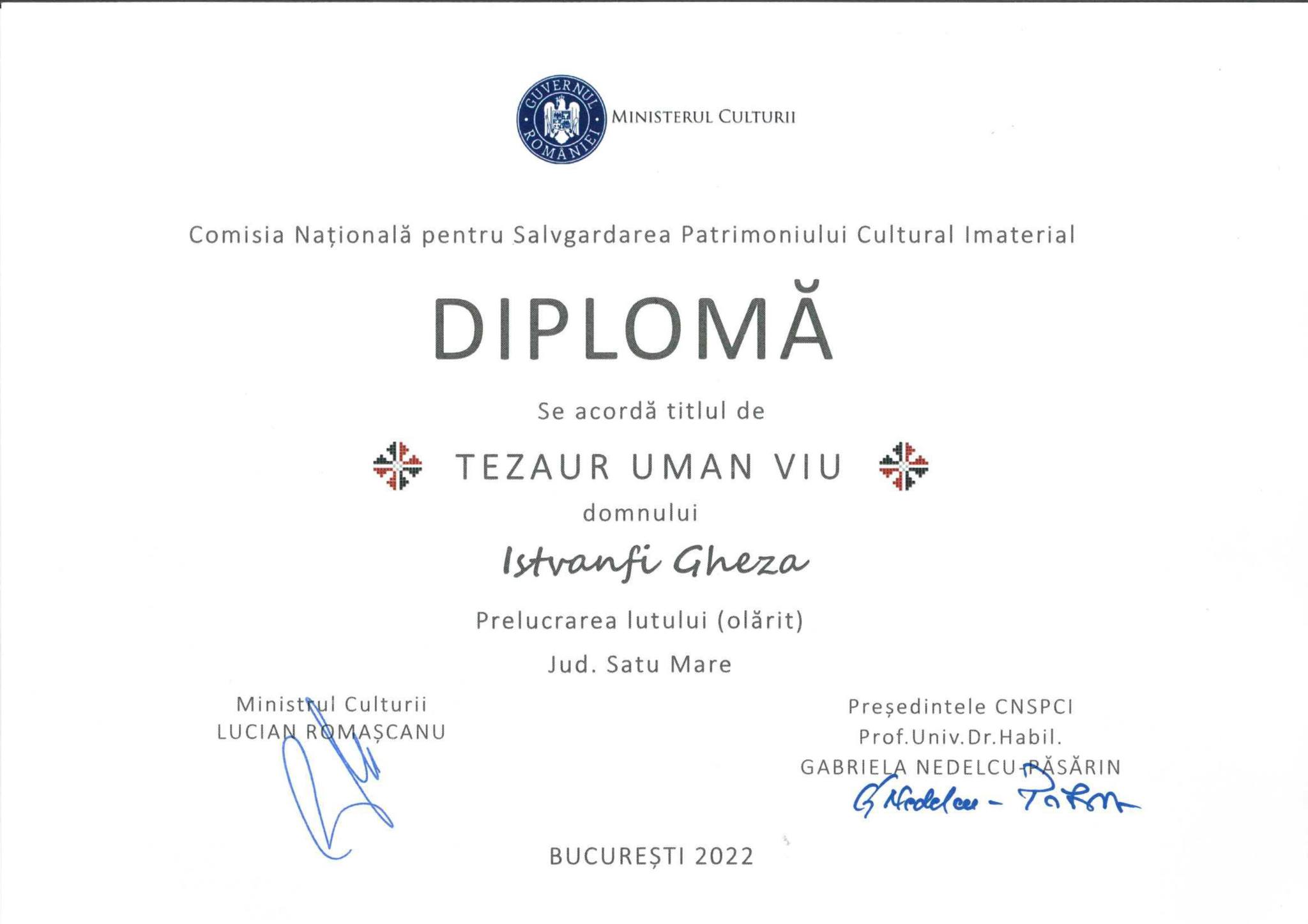 În perioada 24- 25 octombrie 2022, în organizarea Ministerului Culturii şi a Consiliului Judeţean Argeş, prin Centrul de Cultură şi Arte, la Casa de Cultură a Sindicatelor din Pitești, a avut loc Gala „Tezaure Umane Vii” 2022, scopul evenimentului fiind acela de a-i celebra şi premia pe cei care au obţinut titlul de „Tezaure Umane Vii” în anii 2020, 2021 şi 2022. Din delegația sătmăreană au făcut parte: Robert Laszlo – managerul Centrului Județean pentru Conservarea și Promovarea Culturii Tradiționale Satu Mare, meșterul olar – Istvanfi Gheza și soția acestuia, Emma Istvanfi.