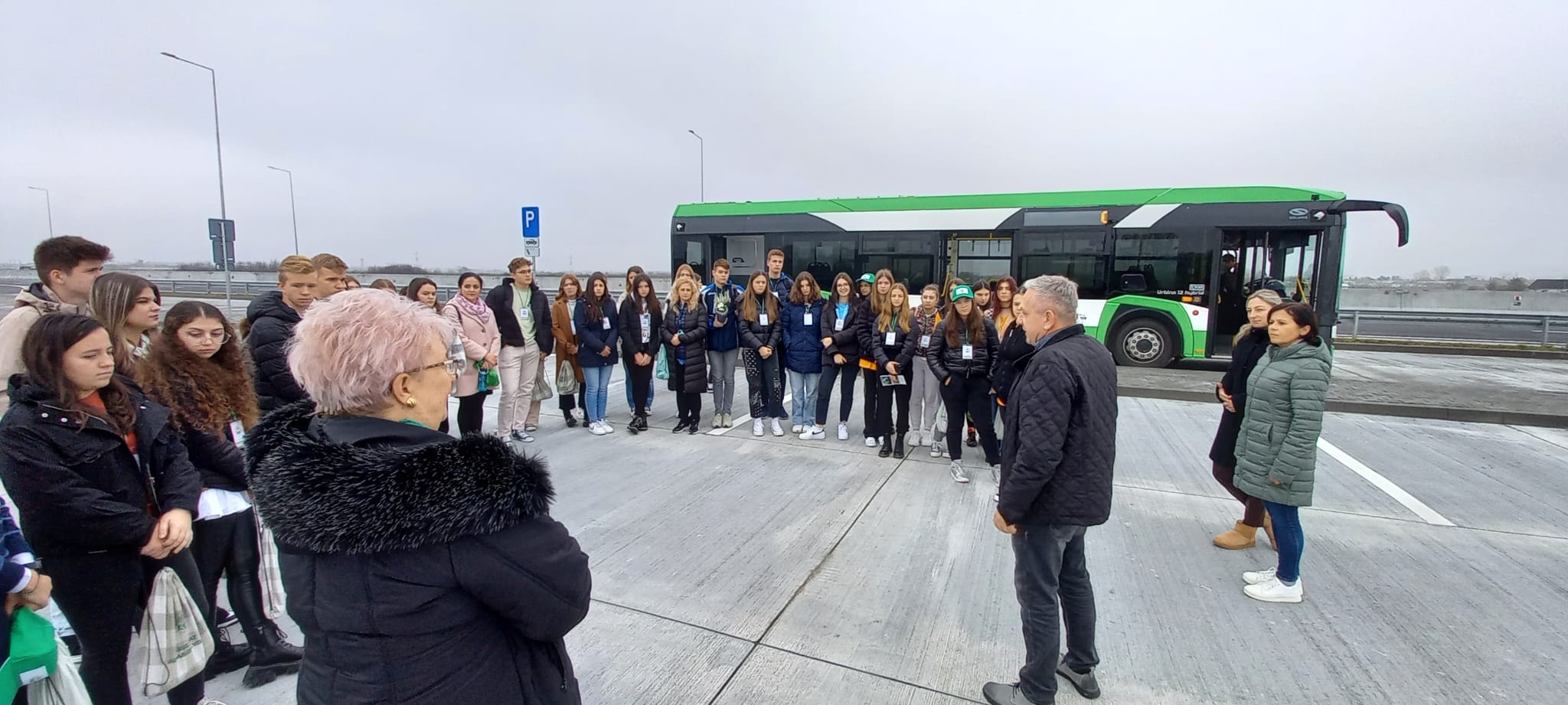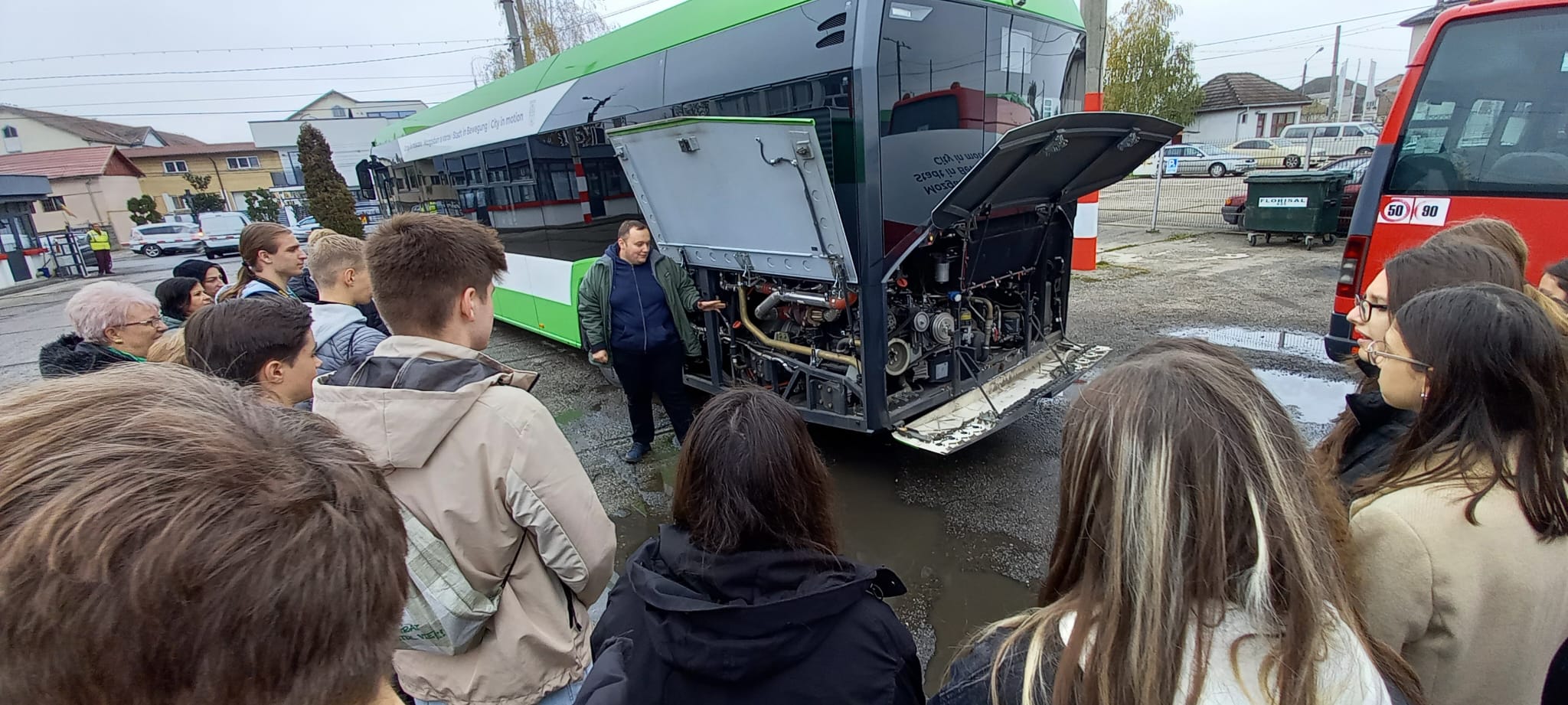 Oprire la TRANSURBAN SA unde, dl.director Ionuț Bujor și specialiștii în domeniul transportului în comun au prezentat parcul de autobuze hibride, principiul lor de funcționare precum și importanța acestor mijloace de transport alternativ din punct de vedere al protecției mediului.