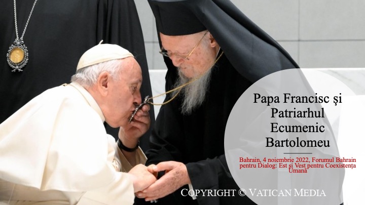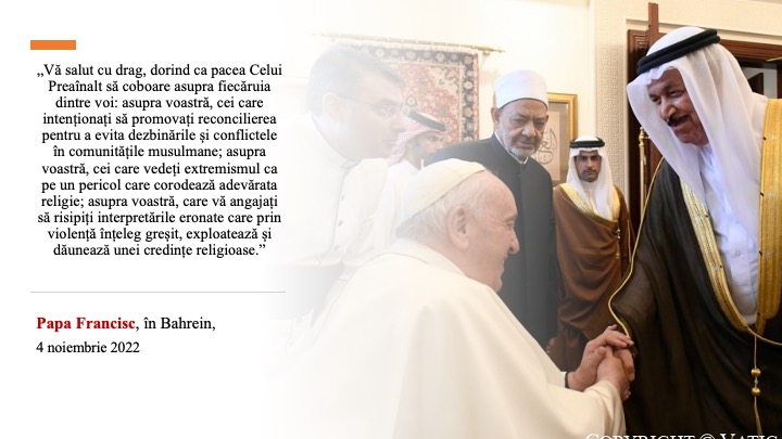 „Dialogul, întâlnirea și călătoria în Bahrain a avut loc și între creștini: de exemplu, prima întâlnire, de fapt, a fost ecumenică, de rugăciune pentru pace, cu dragul Patriarh și frate Bartolomeu și cu frați și surori de diverse confesiuni și rituri, având loc în Catedrala închinată Maicii Domnului a Arabiei, a cărei structură evocă un cort, cel în care, potrivit Bibliei, Dumnezeu l-a întâlnit pe Moise în deșert, pe parcurs. Frații și surorile în credință, pe care i-am întâlnit în Bahrain, trăiesc cu adevărat «în mișcare»: sunt în mare parte lucrători imigranți care, departe de casă, își găsesc rădăcinile în Poporul lui Dumnezeu și familia lor în marea familie, cea a Bisericii. Este minunat să-i vezi pe acești migranți, filipinezi, indieni și din alte părți, creștini adunându-se și susținându-se în credință. Iar aceștia merg înainte cu bucurie, în certitudinea că nădejdea lui Dumnezeu nu dezamăgește (cf. Rom 5, 5). Întâlnind Păstori, bărbați și femei consacrate, lucrători pastorali și, în Liturghia festivă și emoționantă celebrată pe stadion, mulți credincioși, tot din alte țări din Golf, le-am adus afecțiunea întregii Biserici. Aceasta a fost călătoria.”(Papa Francisc, Audiența Generală de miercuri 9 noiembrie 2022, Piața „Sf. Petru” Vatican).