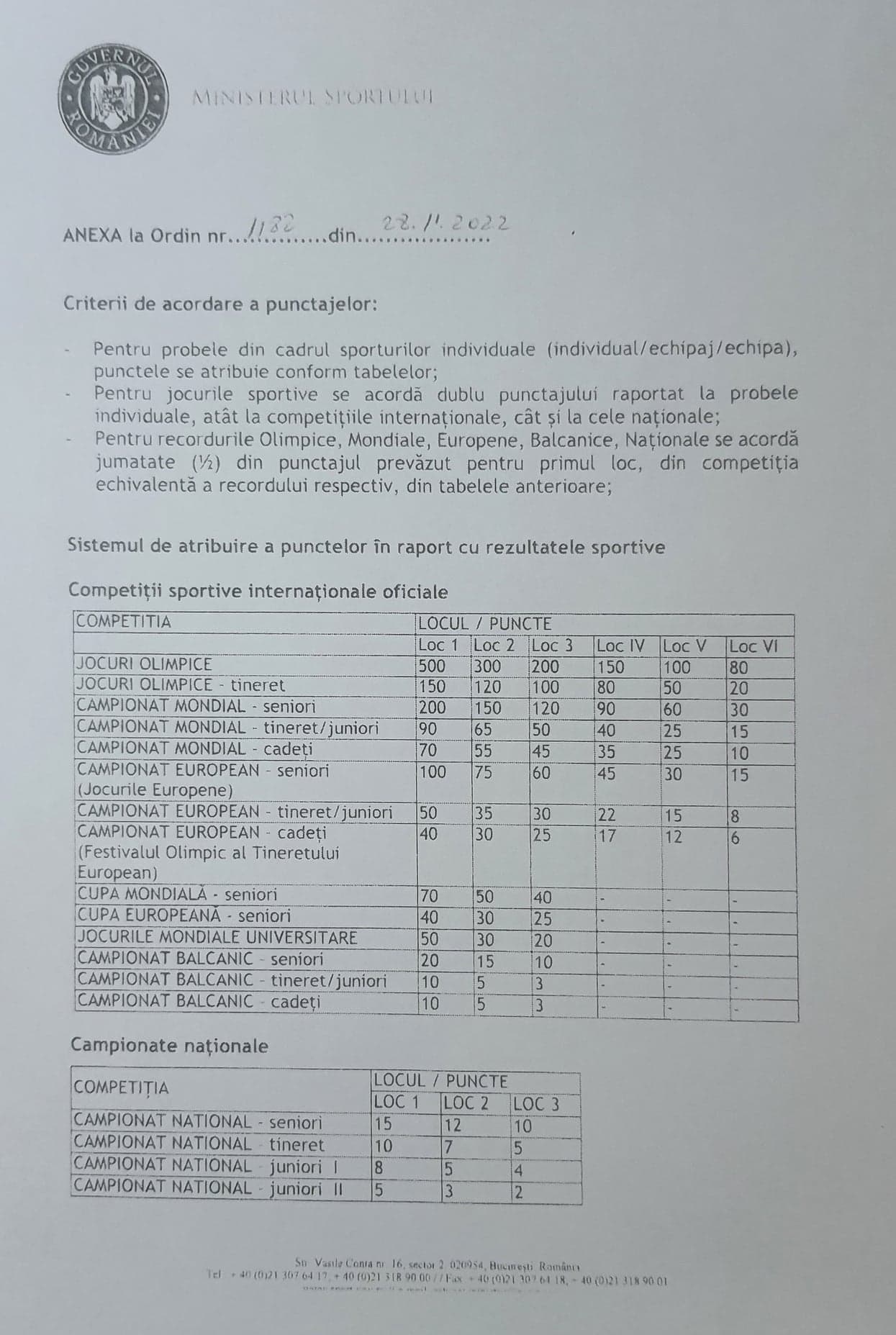 Premierea sportivilor se va face pe bază de punctaj elaborat de Ministerul Tineretului și Sportului.