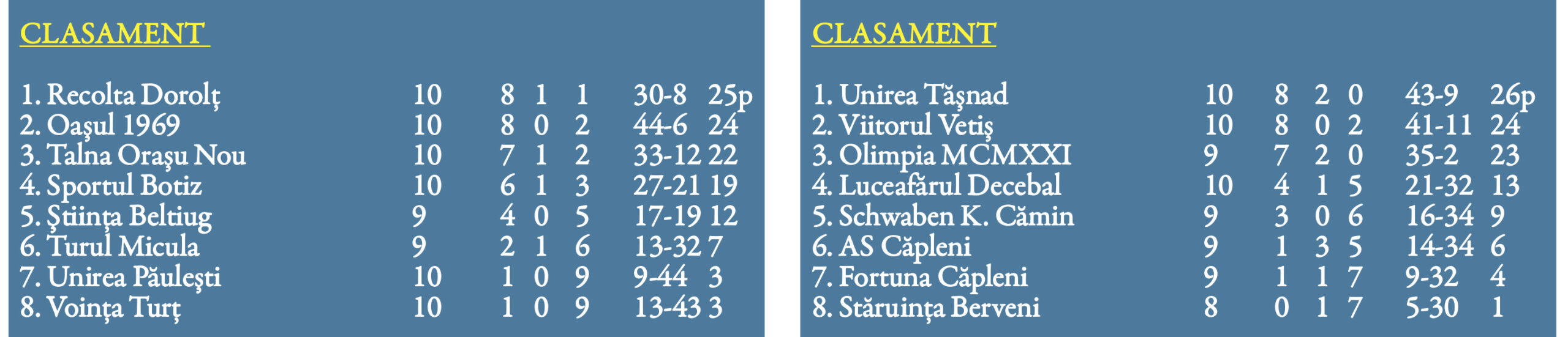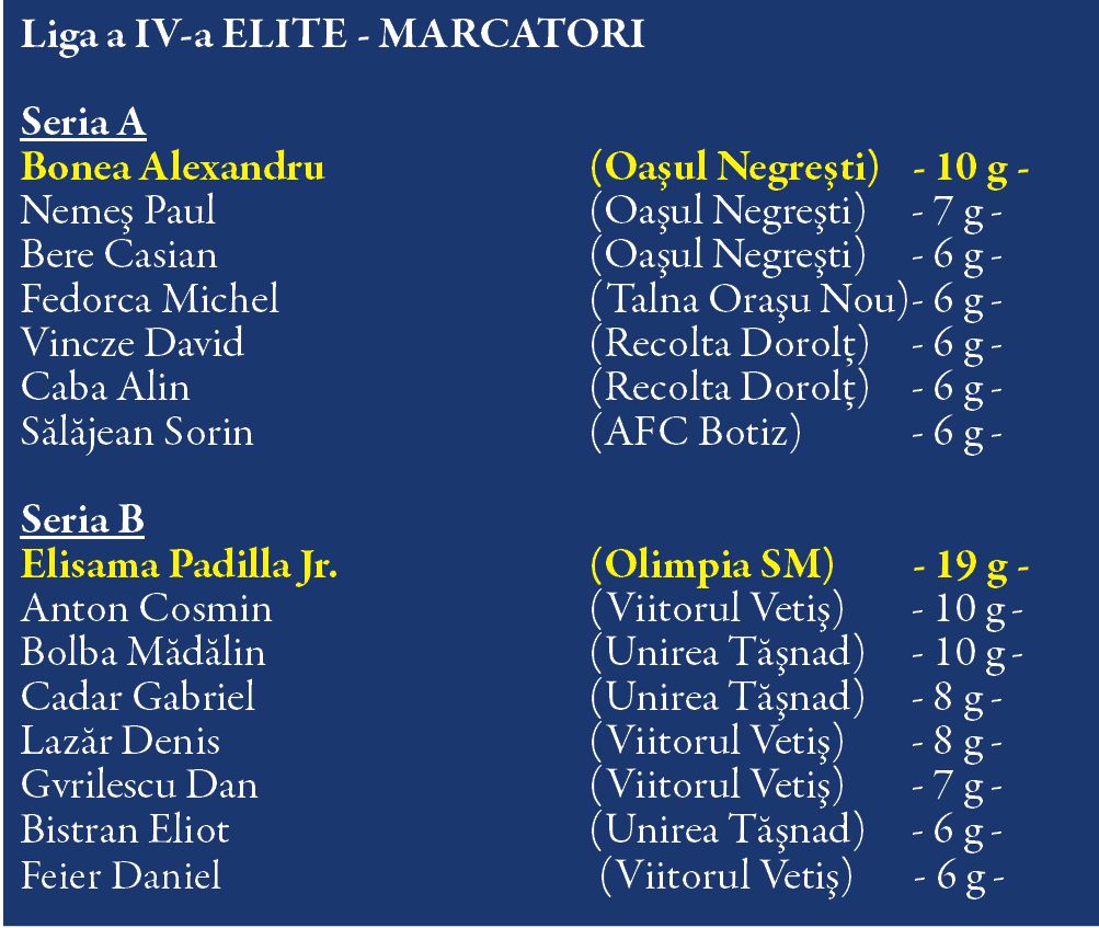 Blăjean CristianPauză în "Elite". Statistici. Lista marcatorilor. Ce urmează în 2023. În acest an s-au consumat 10 etape din sezonul regular (7 din TUR + 3 etape din RETUR). În 2023 rămân de jucat cele 4 etape ale returului. În Seria A, trupa lui Cosmin Iuhas primeşte titlul de campioană de toamnă, la o lungime distanţă de Oaşul, locul secund. Talna are un cuvânt de spus, fiind "acolo" şi ea. Tăşnădenii iernează pe prima treaptă a seriei B, la două puncte faţă de Vetişul lui Popa, urmărite atent de galben-albaştri, locul 3, cu un meci în minus pt. aceştia.