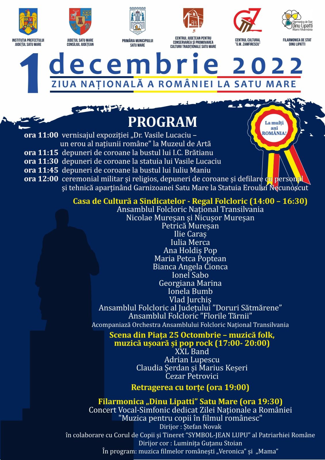 ”În acest an vom avea un program deosebit dedicat Zilei Naționale a României. Cu defilare cu trupe și tehnică militară, cu depuneri de coroane, spectacole și o spectaculoasă retragere cu torțe. Am solicitat la această întâlnire reprezentanților Primăriei municipiului Satu Mare să organizeze în bune condiții și depunerile de coroane de la statuia dr. Vasile Lucaciu în contextul în care în Parcul Central se efectuează lucrări de modernizare. În calitate de prefect al judeţului Satu Mare îi invit pe toţi cetăţenii judeţului nostru să participe la manifestările organizate de Instituţia Prefectului, Consiliul Judeţean şi Primăria municipiului Satu Mare. Ne dorim să sărbătorim Ziua Naţională a României împreună și să participăm la toate activităţile incluse în agenda zilei de 1 Decembrie. Sper că vom fi în număr cât mai mare, dragi sătmăreni!”- prefect Radu Roca.