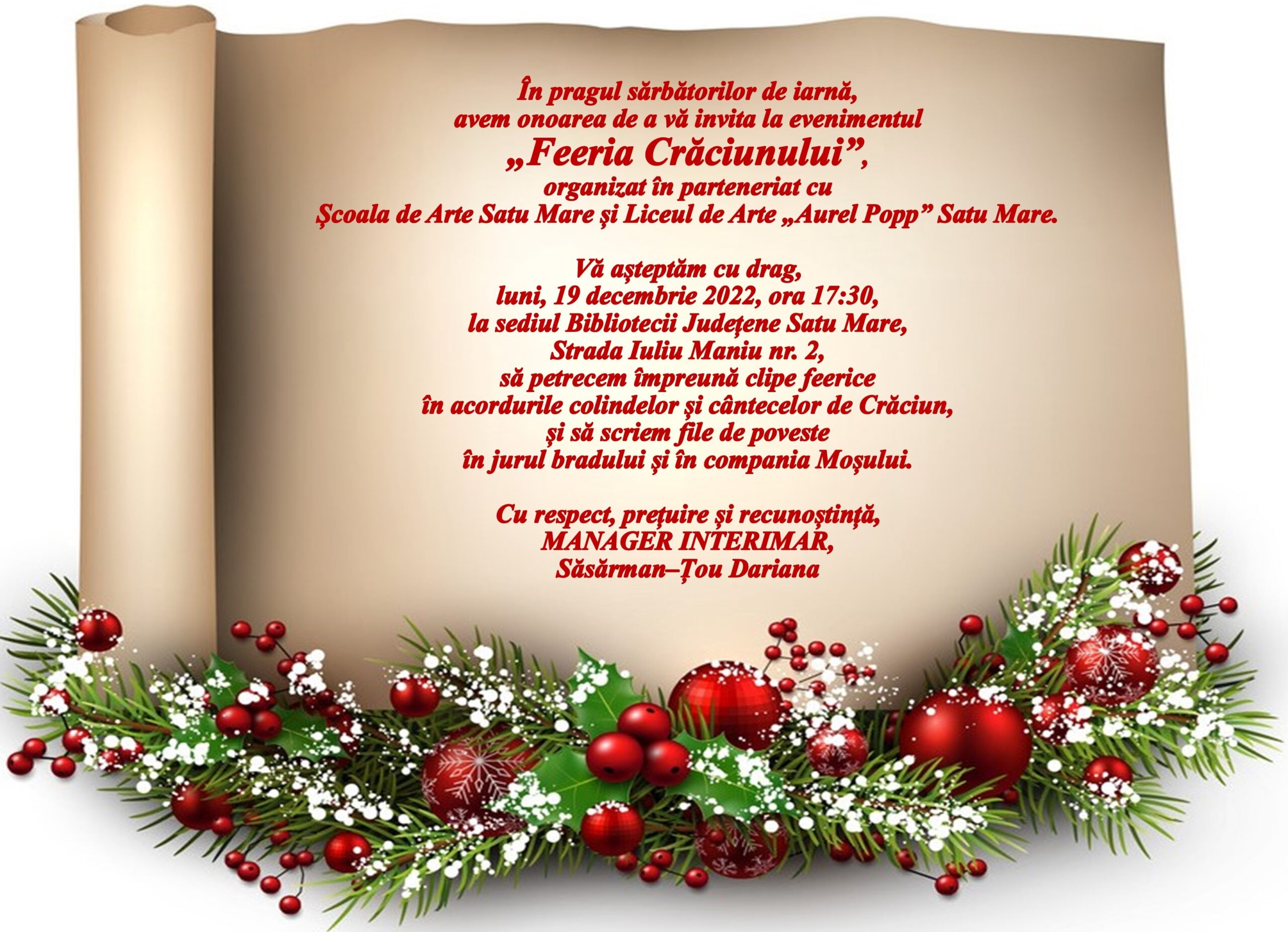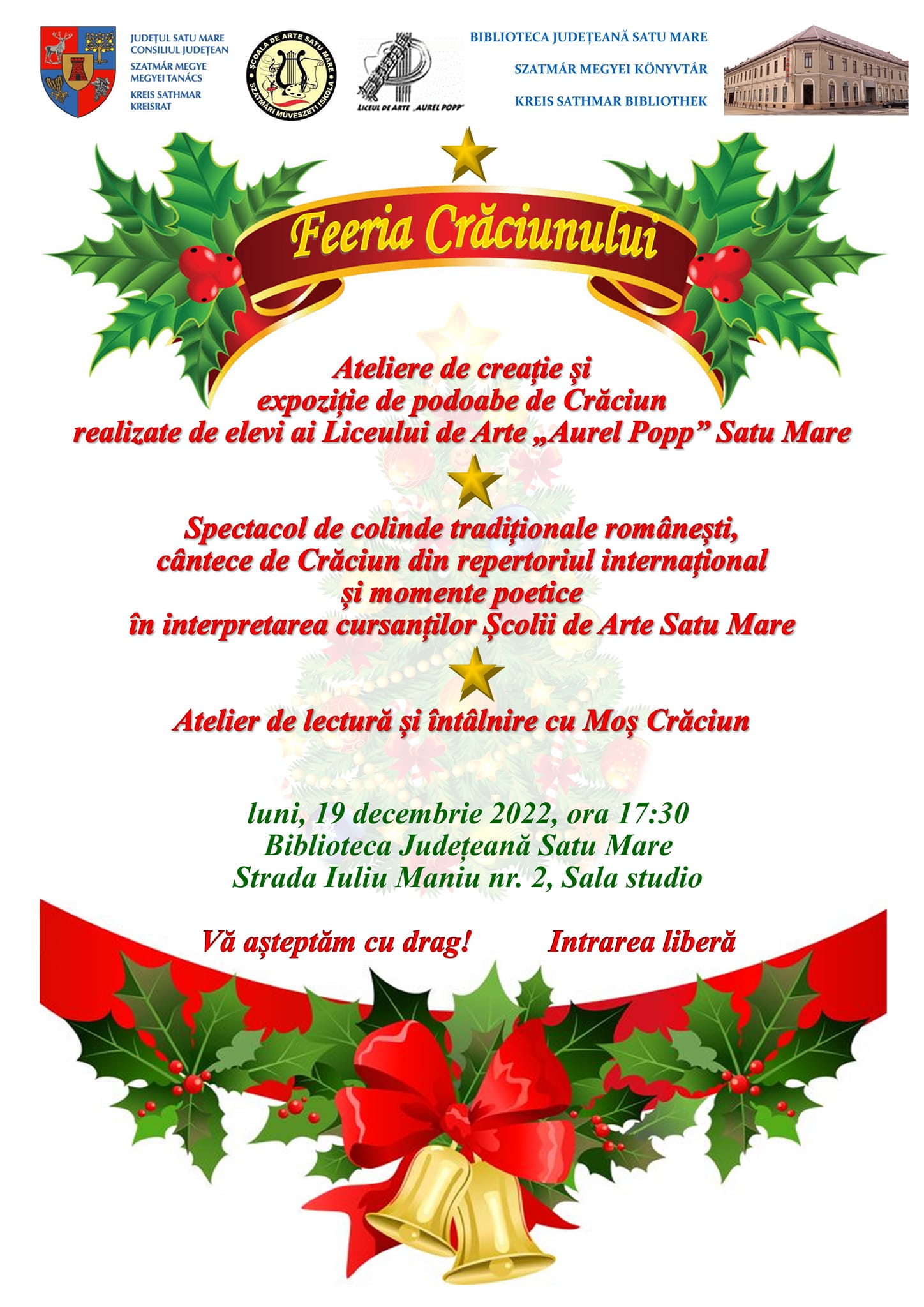 Biblioteca Județeană Satu Mare în parteneriat cu Școala de Arte Satu Mare și Liceul de Arte „Aurel Popp” Satu Mare organizează luni, 19 decembrie, evenimentul „Feeria Crăciunului”. Într-un cadru de sărbătoare, în jurul bradului și în compania Moșului, evenimentul va debuta la ora 17:30 cu un spectacol de colinde tradiționale, cântece de Crăciun din repertoriul românesc și internațional și momente poetice, avându-i ca protagoniști pe cursanții Școlii de Arte Satu Mare, coordonați de inimoșii lor profesori.
