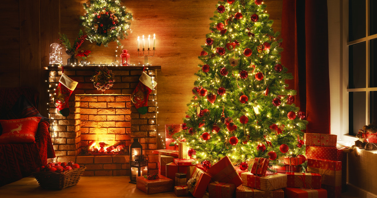Toned photo of decorated Christmas tree and gift boxes against burning fireplace