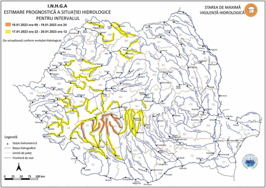 Așadar, în intervalul 17.01.2023 ora 22:00 – 20.01.2023 ora 12:00, pe râurile din bazinele hidrografice: Tur (judeţul Satu Mare), Tisa – sector aferent S.H. Valea Vişeului, Vişeu, Iza, Lăpuş (judeţul Maramureş), Someşul Mare – bazin superior şi afluenţi bazin mijlociu şi inferior (judeţul Bistriţa Năsăud), Someşul Mic – bazin amonte S.H. Apahida (judeţele: Bihor şi Cluj), Crişul Repede – bazin superior şi afluenţi bazin mijlociu şi inferior (judeţele: Cluj şi Bihor), Crişul Negru – bazin superior şi afluenţi bazin mijlociu şi inferior (judeţele: Bihor şi Arad), Crişul Alb – bazin amonte S.H. Gurahonţ (judeţele: Hunedoara şi Arad), Arieş – bazin amonte S.H. Baia de Arieş şi afluenţii aferenţi sectorului aval S.H. Baia de Arieş (judeţele: Alba şi Cluj) și în alte peste 10 județe din țară, va intra în vigoare un Cod galben de inundații.