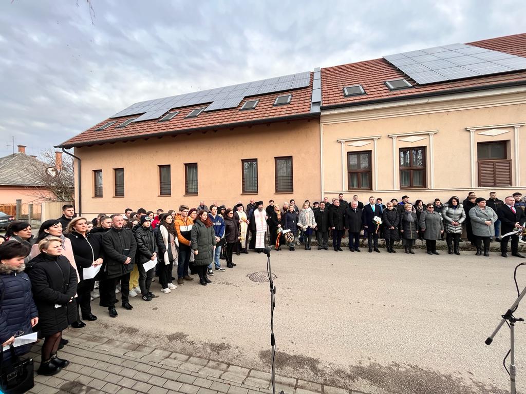 Placa comemorativă a fost sfinţită de către Preasfințitul Părinte Siluan, episcopul Eparhiei Ortodoxe Române din Ungaria (EORU), împreună cu un sobor de preoţi. Preşedintele AŢRU, Gh. Cozma, a adresat un cuvânt de salut, în care a reliefat importanţa simbolică a amplasării plăcii comemorative dedicate lui Mihai Eminescu la Gyula, oraş ce constituie sediul celor mai importante instituţii ale comunităţii istorice româneşti din Ungaria, dar şi o importantă destinaţie turistică pentru români. El a spus că această placă se doreşte a fi un liant pentru comunitatea românească din Ungaria, dar şi un simbol care să ajute la dezvoltarea unor relații şi mai bune între România şi Ungaria.