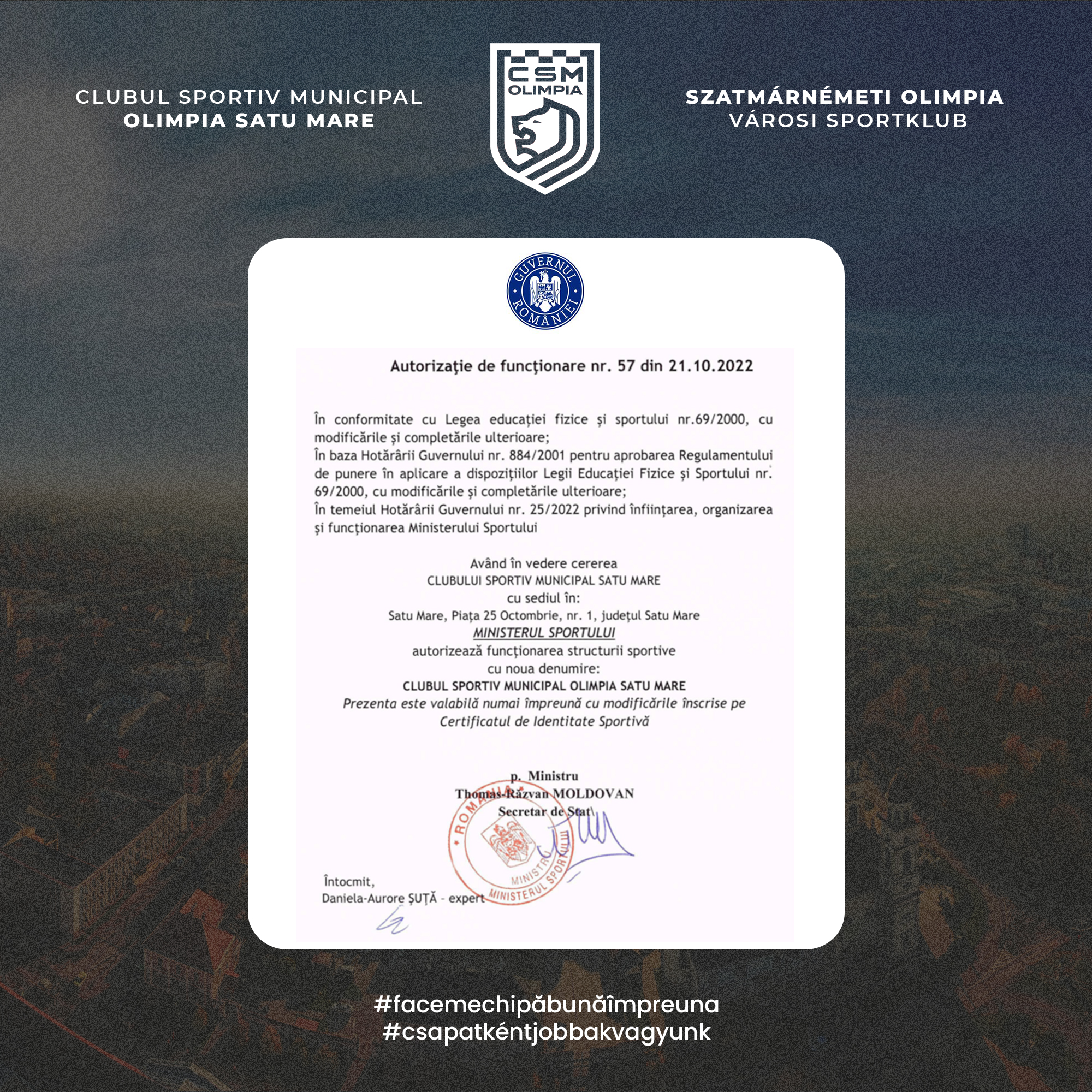 – În primul rând, desigur, rezultatele excelente ale sportivilor și al echipelor din cadrul clubului mă mulțumesc cel mai mult, deoarece pentru ei lucrăm. O altă realizare este că am obținut o clădire pentru sediul clubului, a cărei renovare am început-o deja și sper ca până în vara anului acesta să o finalizăm. Un pas important în istoria clubului este schimbarea denumirii. Din 22 octombrie 2022 denumirea oficială al clubului nostru este Clubul Sportiv Municipal Olimpia Satu Mare. Acest aspect este foarte important, deoarece denumirea Olimpia în cei 100 de ani de istorie a fost într-o anumită formă de fiecare dată al administrației locale. Asta așa trebuie să rămână, așa-i corect.
