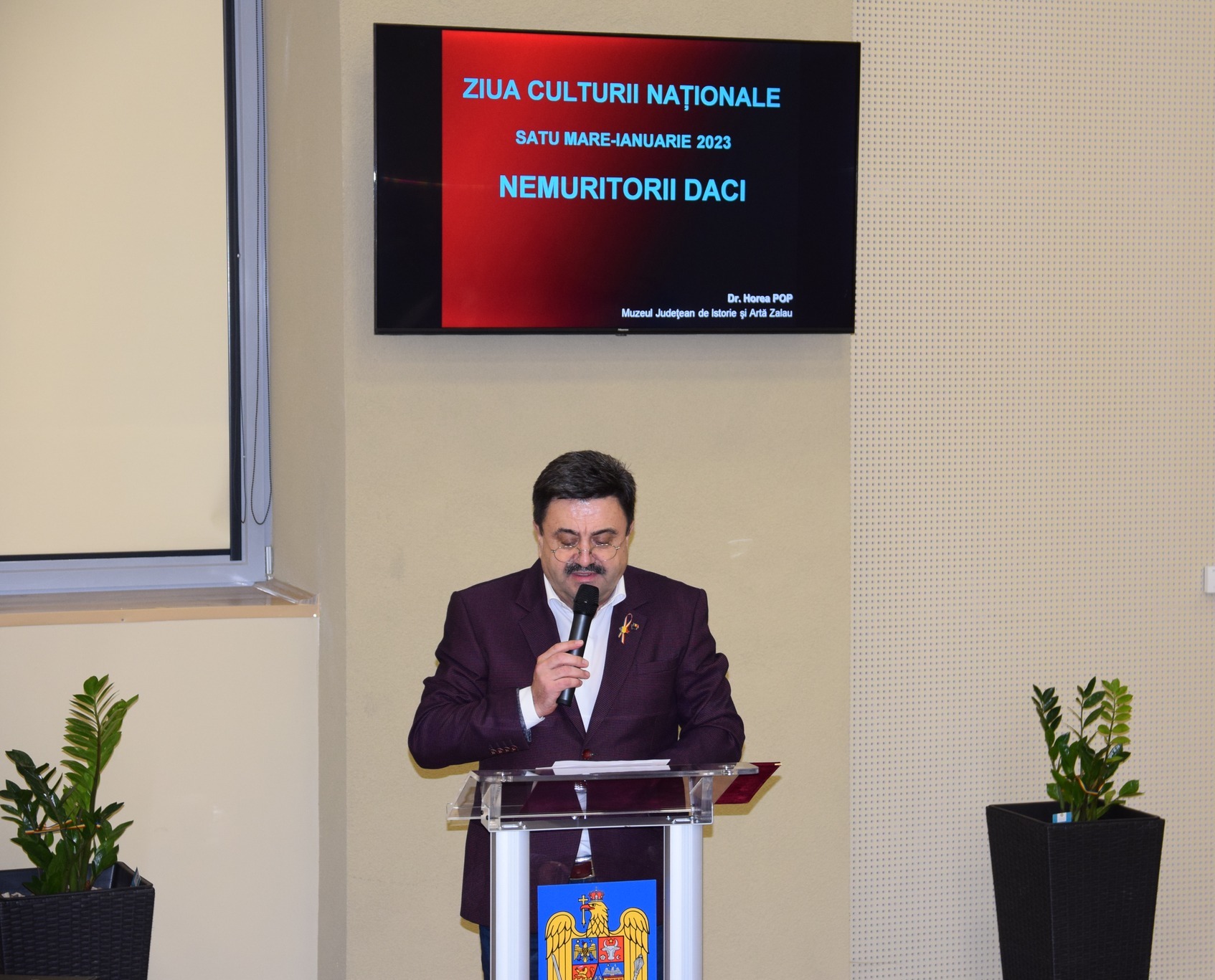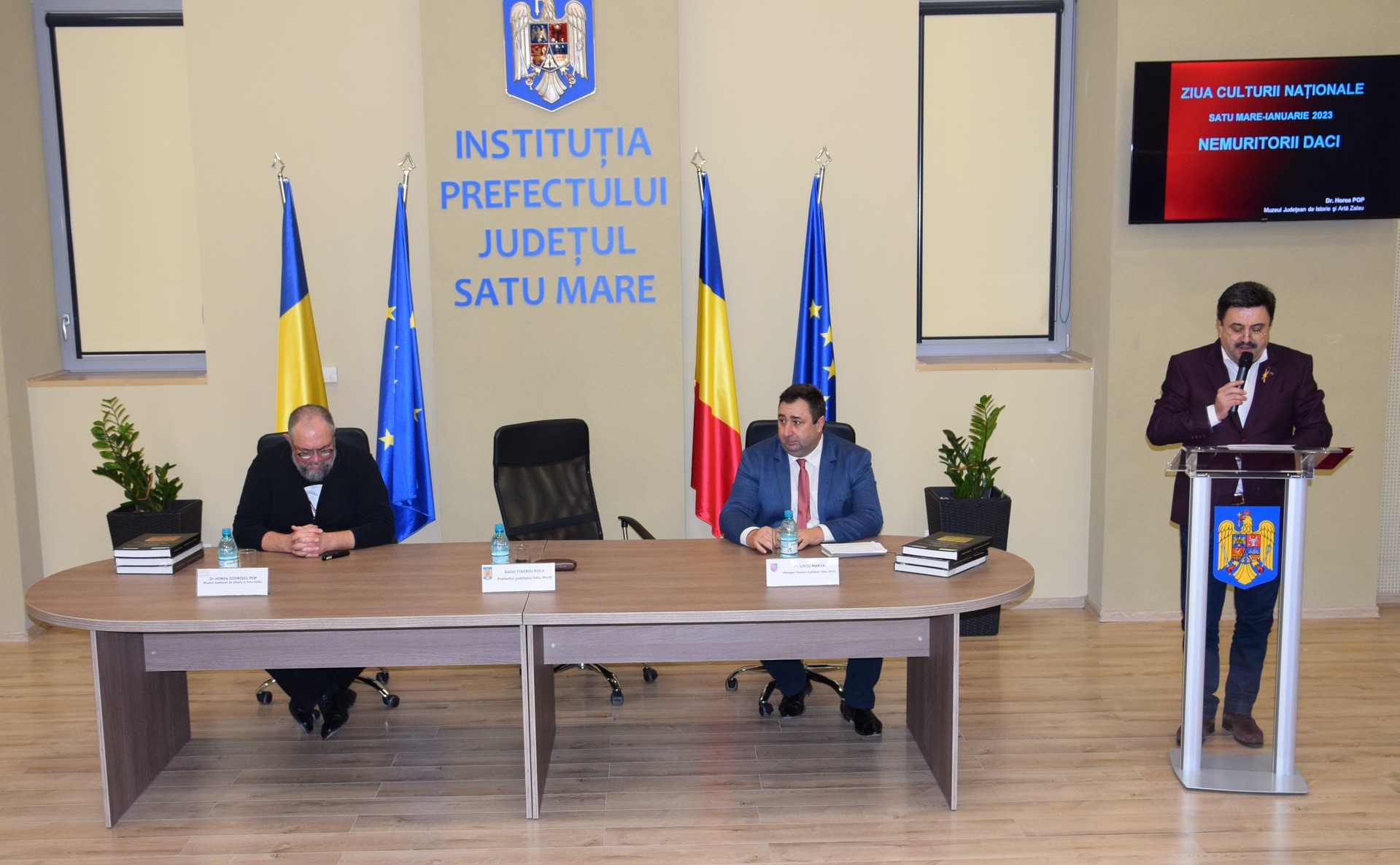 Sala mare de ședințe a Instituției Prefectului județul Satu Mare a fost azi gazda prezentării susținută de dl. Horea Pop (cercetător-arheolog la Muzeul Județean de Istorie și Artă Zalău) cu tema -Nemuritorii daci.