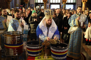 Conform rânduielii tipiconale, după rugăciunea amvonului, Preasfinția Sa a oficiat Slujba de sfințire a apei celei Mari, cunoscută și sub denumirea de Aghiasmă Mare.