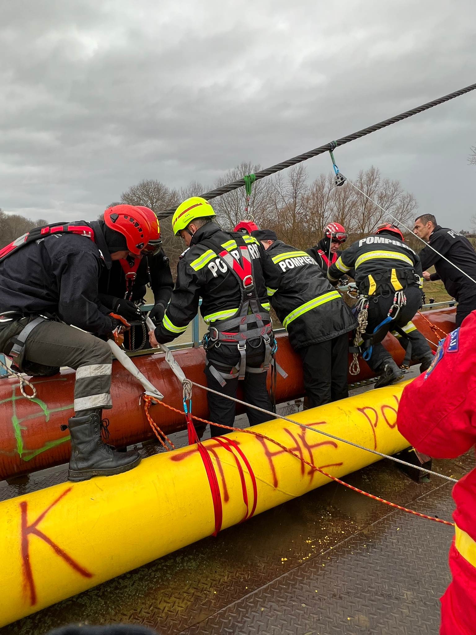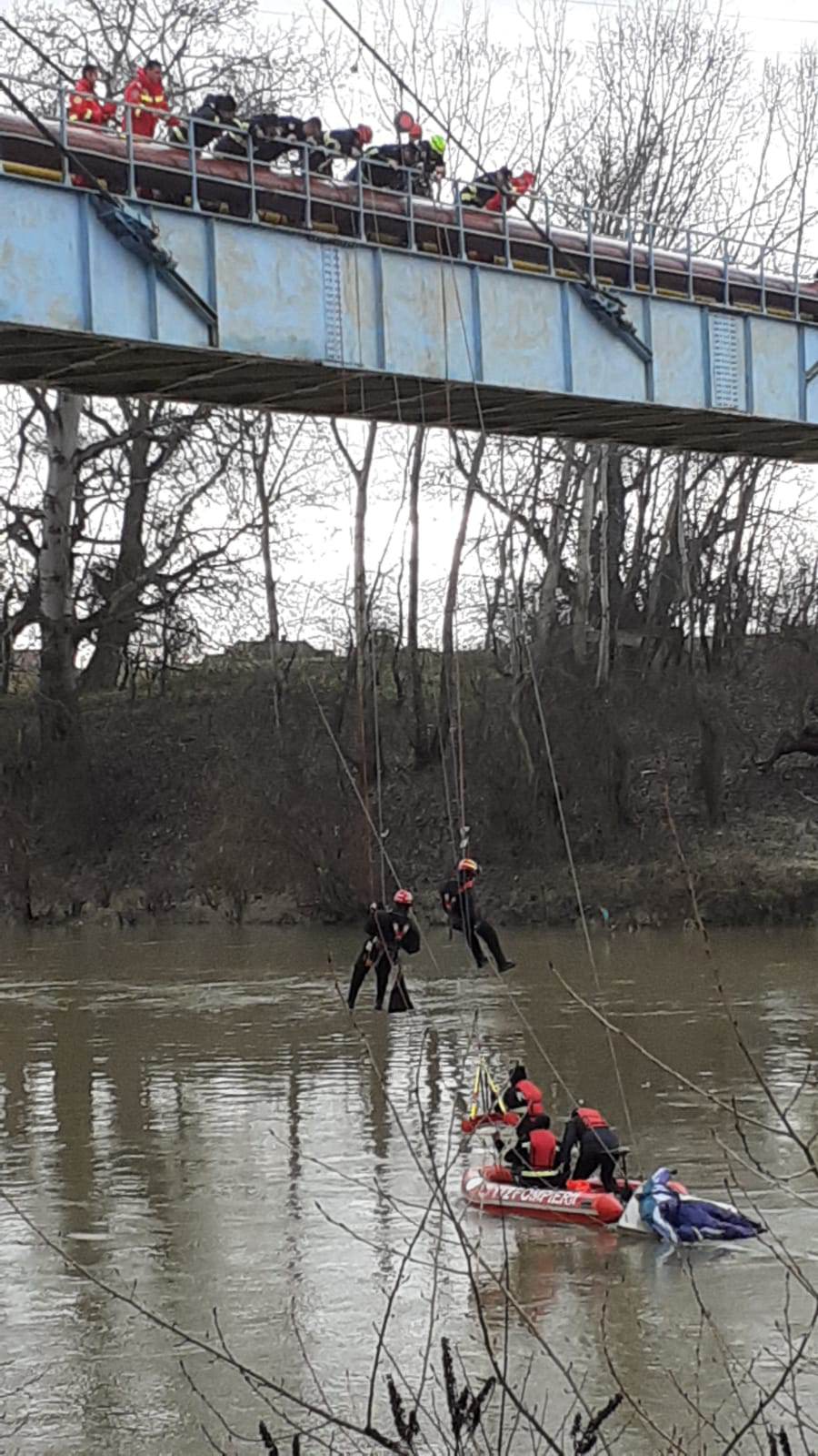 Un echipaj de alpiniști coboară de pe podul tehnologic la victimă iar un alt echipaj se îndreaptă cu barca pneumatică către aceștia.