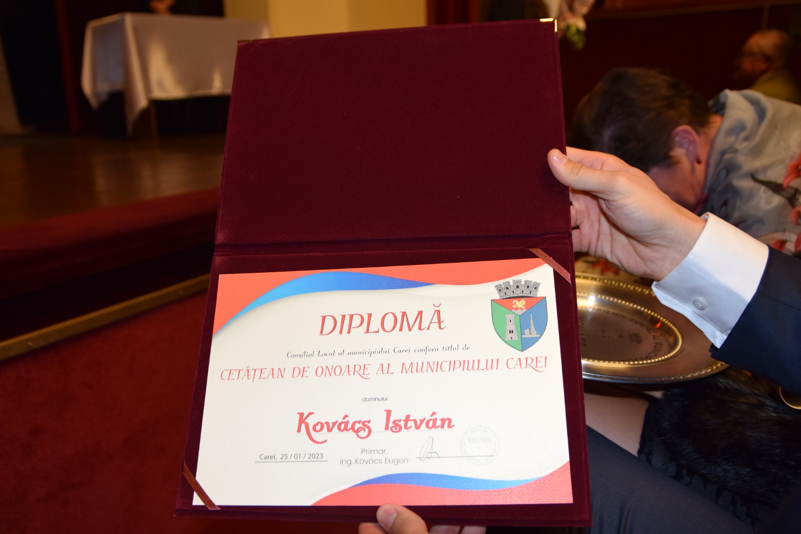 Miercuri seara la sala Teatrului Municipal Carei a avut loc ceremonia de înmânare a titlului de Cetățean de Onoare al Careiului arbitrului internațional Kovacs Istvan şi de înmânare a titlurilor PRO URBE fostului grădinar șef și director al DSPL Carei, Adorján Csaba, respectiv directorului Direcției de Cultură Carei, Bogdan Georgescu.