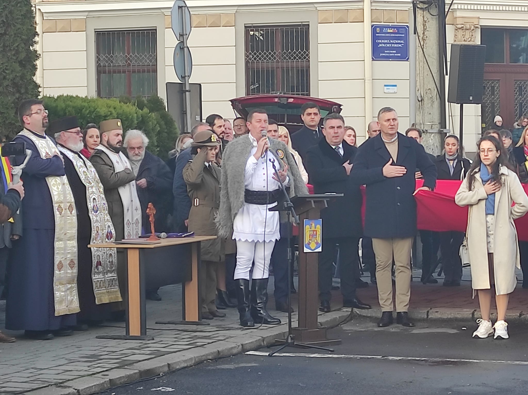 Lista manifestărilor s-a deschis cu prezentarea onorului de către Garda de Onoare, iar în continuare, artistul sătmărean Petrică Mureșan a intonat Imnul Național al României. Nelipsit a fost ceremonialul religios susținut de către preoții militari din garnizoana Satu Mare.