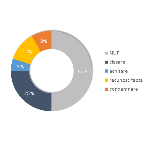 | 12% | dintre cazuri se finalizează cu recunoașterea faptei de către acuzat și condamnarea acestuia; |