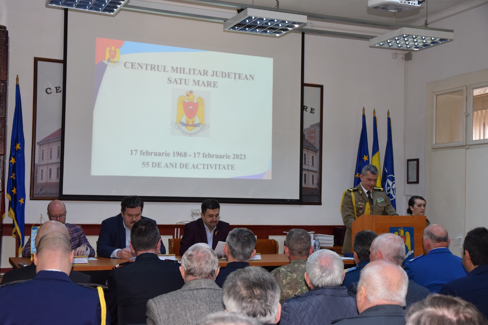 În cadrul manifestărilor, comandatul Centrului Militar Judeţean Satu Mare, dl. Lt.col. Gheorghe Balazs, a prezentat istoricul instituției, principalele activitățişiatribuțiunile specifice acesteia, alocuțiunesusținută de prezentări care au ilustrat cele mai importante momente din trecutul unității.