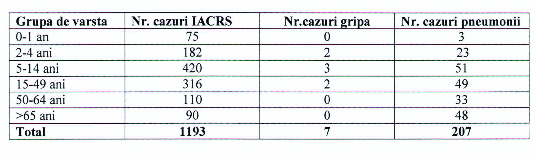 - La nivelul judetului, numarul total de cazuri de infectii respiratorii acute ( IACRS, pneumonii si gripe) a fost de 1193, comparativ cu 1431, inregistrate in saptamana precedenta.