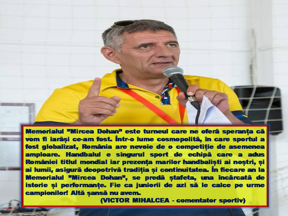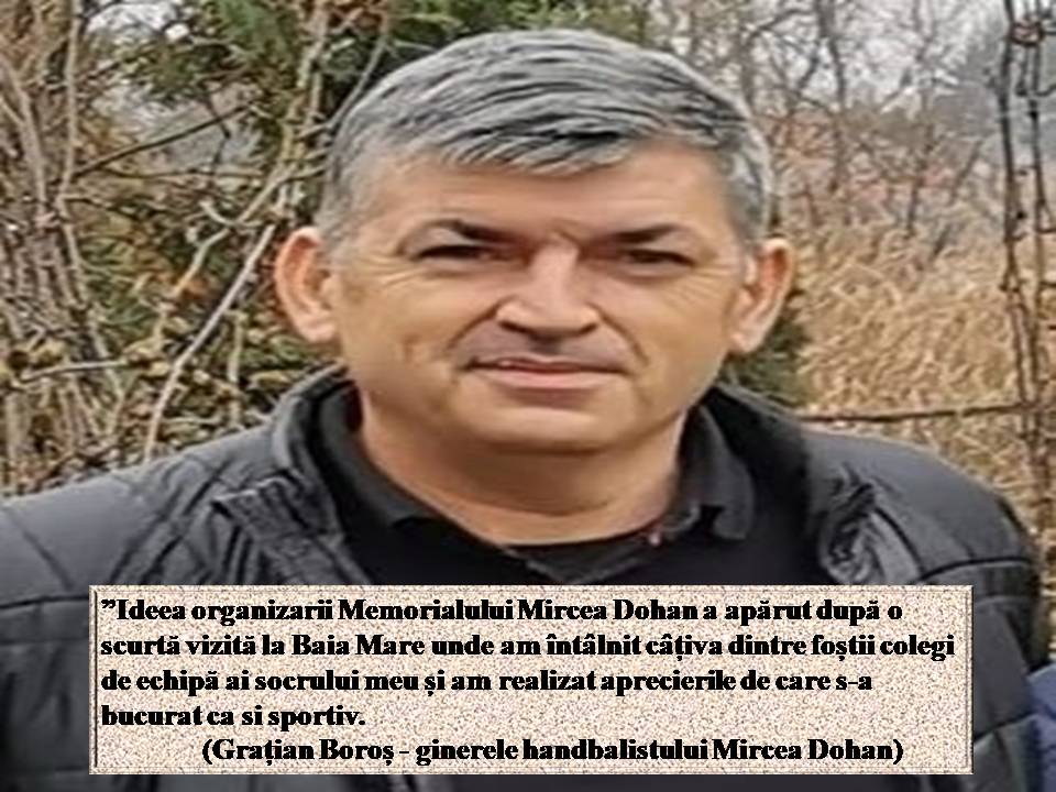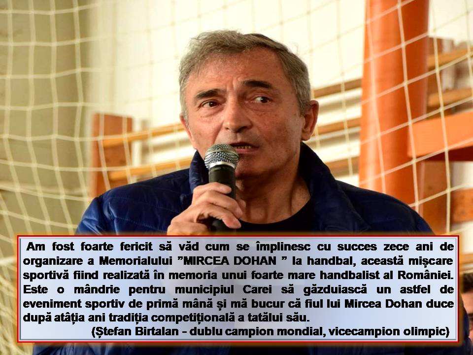 ”Mircea era un tip dornic de a face performanță, i-am admirat pasiunea și devotamentul pentru handbal. Prima editie a Memorialului ”Mircea Dohan” în anul 2012 a fost încărcată de emoții, deoarece ne-am revăzut colegii după o perioadă de peste 35 de ani. Îmi amintesc cu nostalgie punctul de întâlnire - lângă Monumentul Ostașului Român din Carei. Reușita acestui eveniment ne-a încurajat să continuăm organizarea turneului și în anii următori.