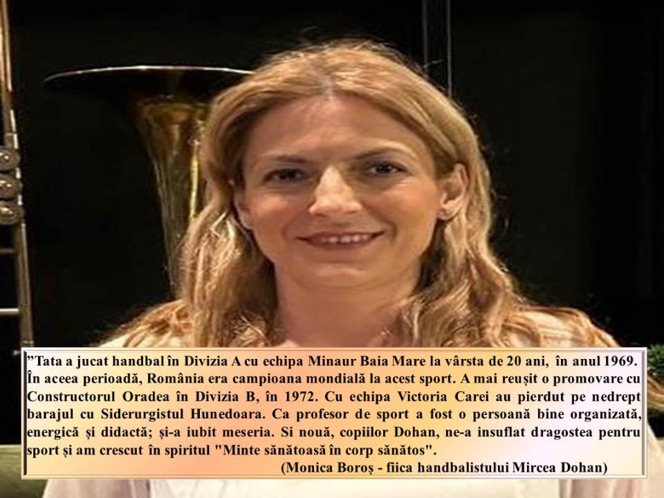 ”Careiul este un oraș cu tradiție în handbal. În tinerețe, tata și colegii lui de breaslă au îndrumat generații de elevi în tainele acestui sport. A fost o persoană atașată de orașul Carei; bun organizator de competiții, în cadrul școlii și a urbei erau nelipsite concursurile și turneele sportive planificate cu măiestrie de dl. prof Mircea Dohan. Crescând în acest spirit, am decis împreună cu sora mea, Monica Boros să înființăm Asociația ”Club Sportiv Mircea Dohan”.