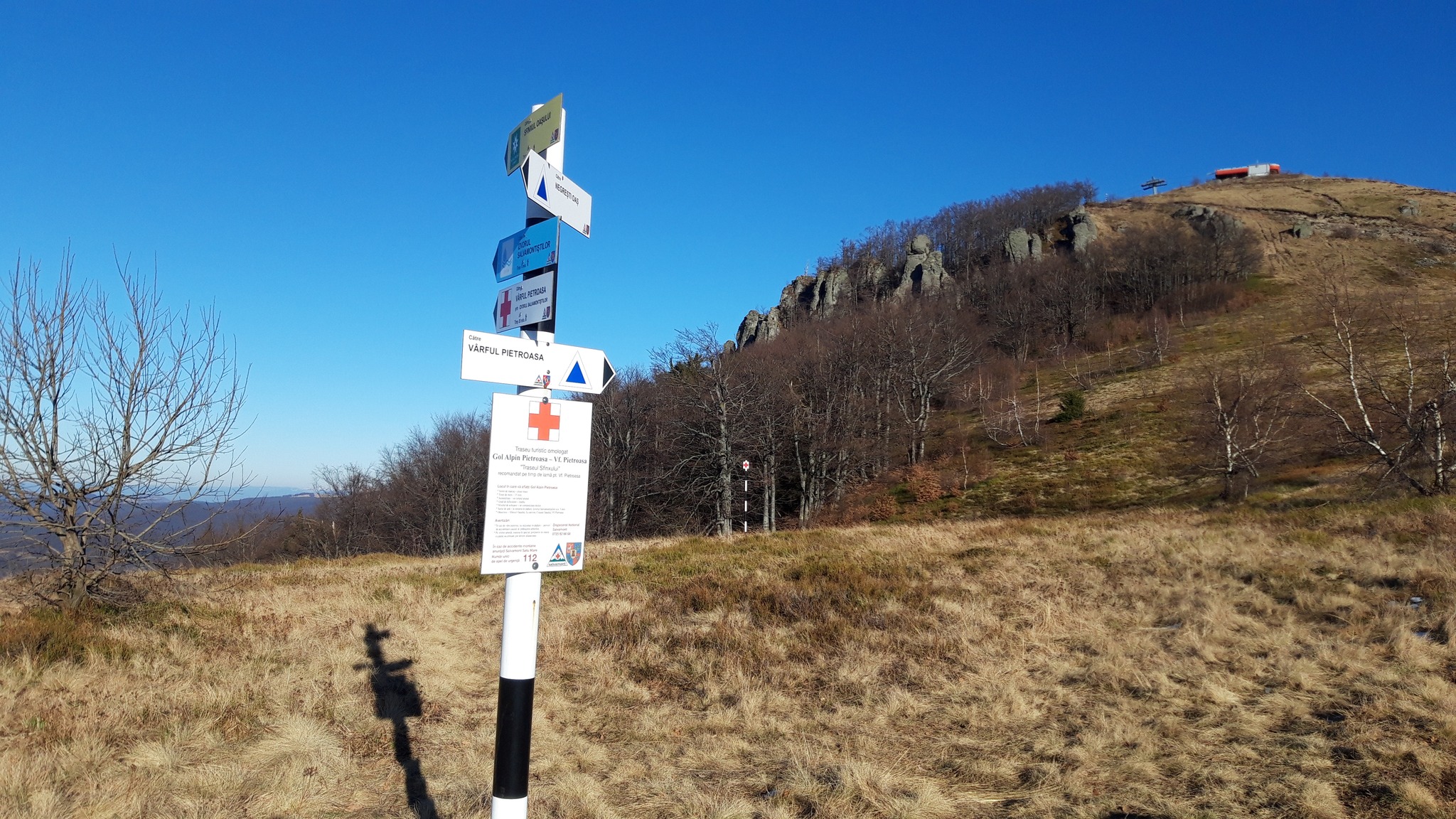 Prima propunere de tură montană se referă la o abordare mai diversificată a vârfului Pietroasa privit atât prin ochii unui drumeț cât și a unui cățărător. Intrarea în traseu o facem din Parcare Telescaun Luna Șes. Din parcare, ne încadrăm ghidați de stâlpul de marcaj echipat cu săgeți informative , pe drumul forestier marcat cu Triunghi albastru, care se încadrează pe curba de nivel cca. 2 km până la o intersecție marcată, unde o vom coti la stânga. Practic, de aici începe o urcare ușoară de cca 1 km până în Poiana Boroș, la a cărei intrare vom găsi un izvor ascuns sub un stan de piatră. Din Poiana Boroș, urcușul se accentuează și ne solicită pe o distanță de cca 1 km până la ieșirea în golul alpin unde beneficiem de un mic platou în marginea căruia se găsește Izvorul Pietroasa și locul de popas. După o scurtă pauză începem din nou urcușul pe drumul plin de pietre, ca după cca 1 km să atingem linia de creastă ce vine din dreapta de către Piatra Tâlharului, marcat Bandă Roșie, care la rândul ei împreună cu marcajul nostru ajung pe vârful Pietroasa, prin Poteca Callunei. Noi nu vom urma această rută, deoarece la întâlnirea cu linia de creastă, pe mâna stângă, vom găsi intrarea pe traseul Sfinxului, marcat Cruce Roșie, care ne va conduce prin zona de stâncărie pe lângă Sfinxul Oașului, Trei Turnuri și punctul de panoramă Crucea Oașului, asta, înainte de a ajunge pe vârful Pietroasa.