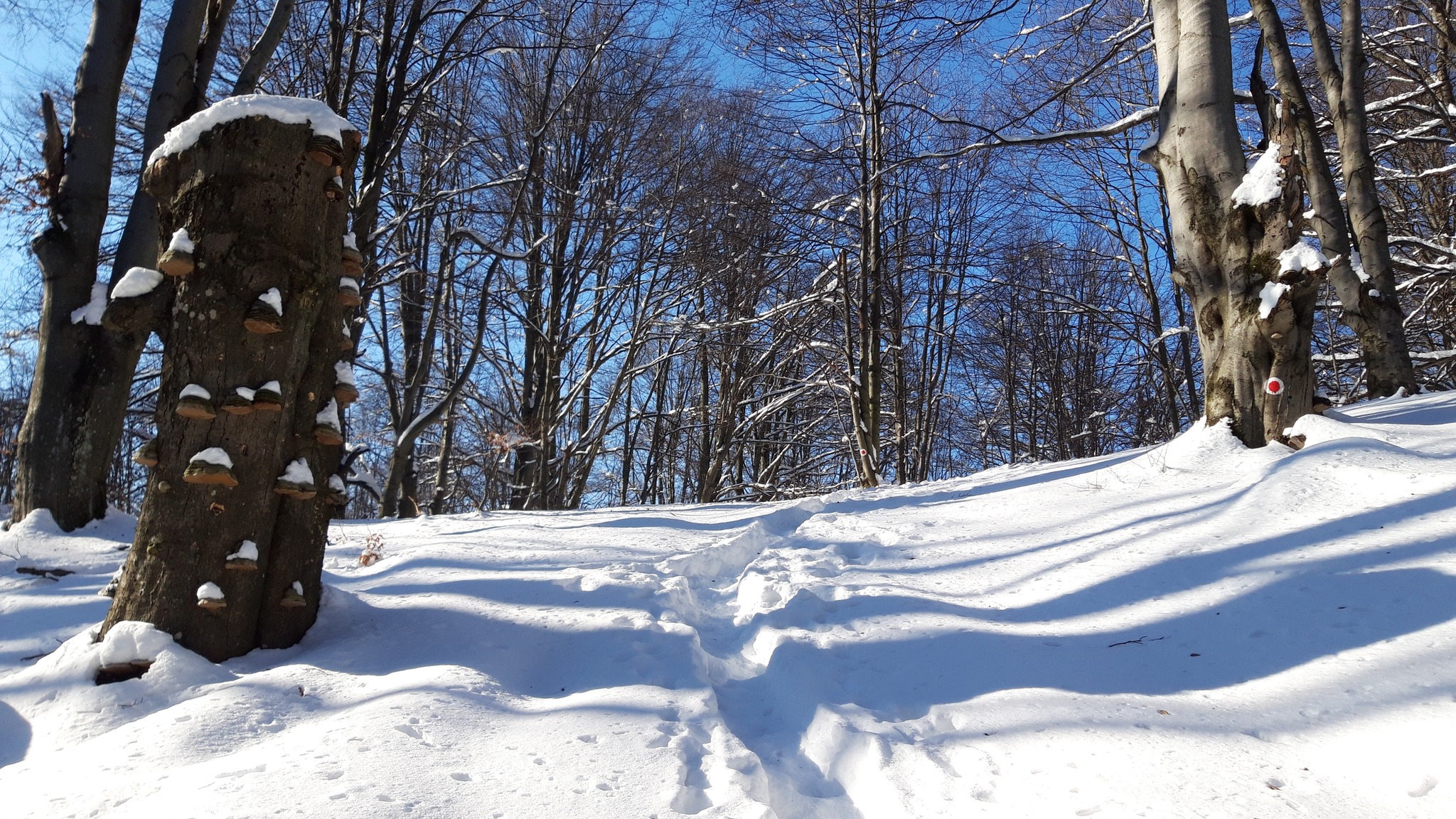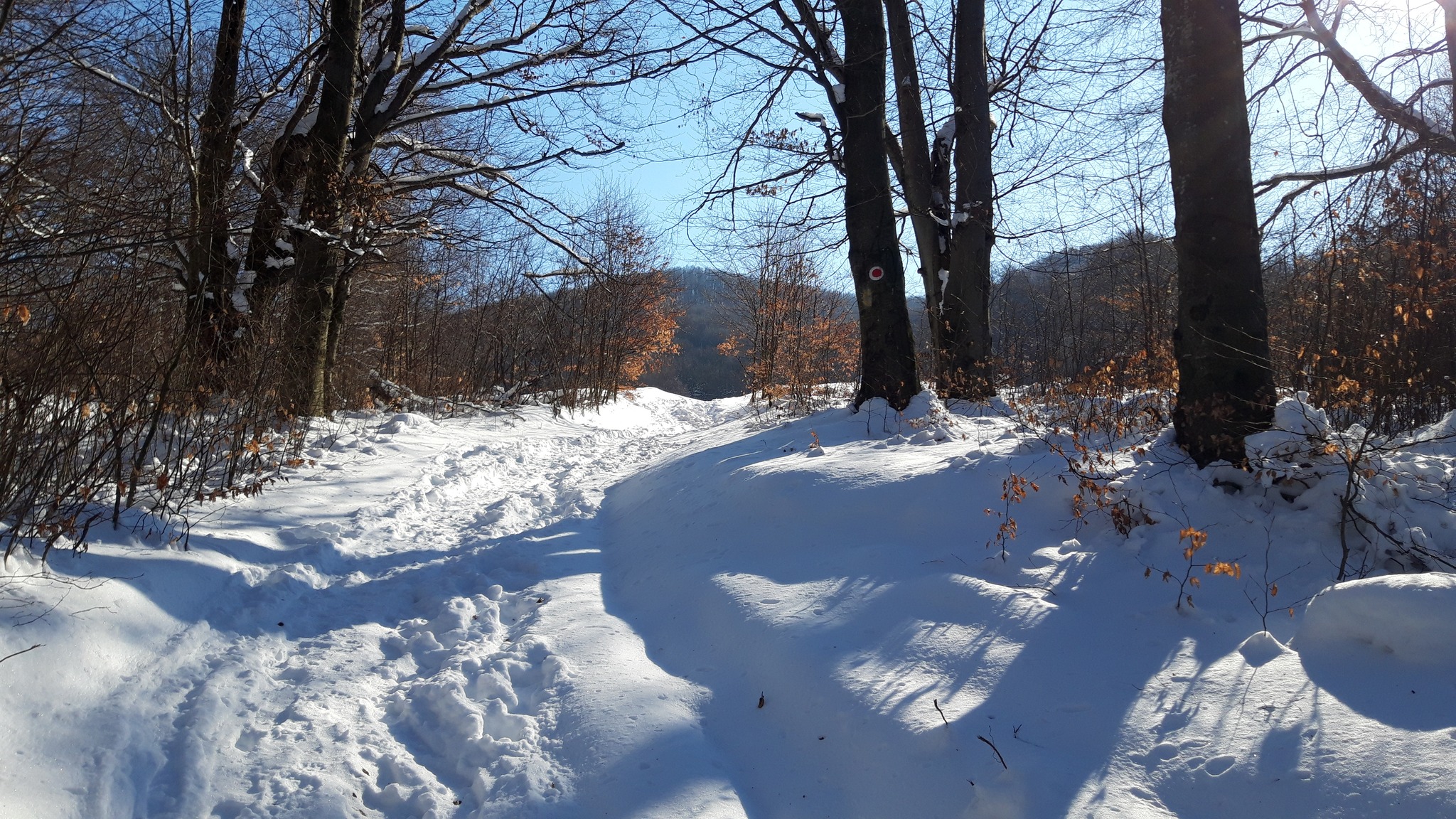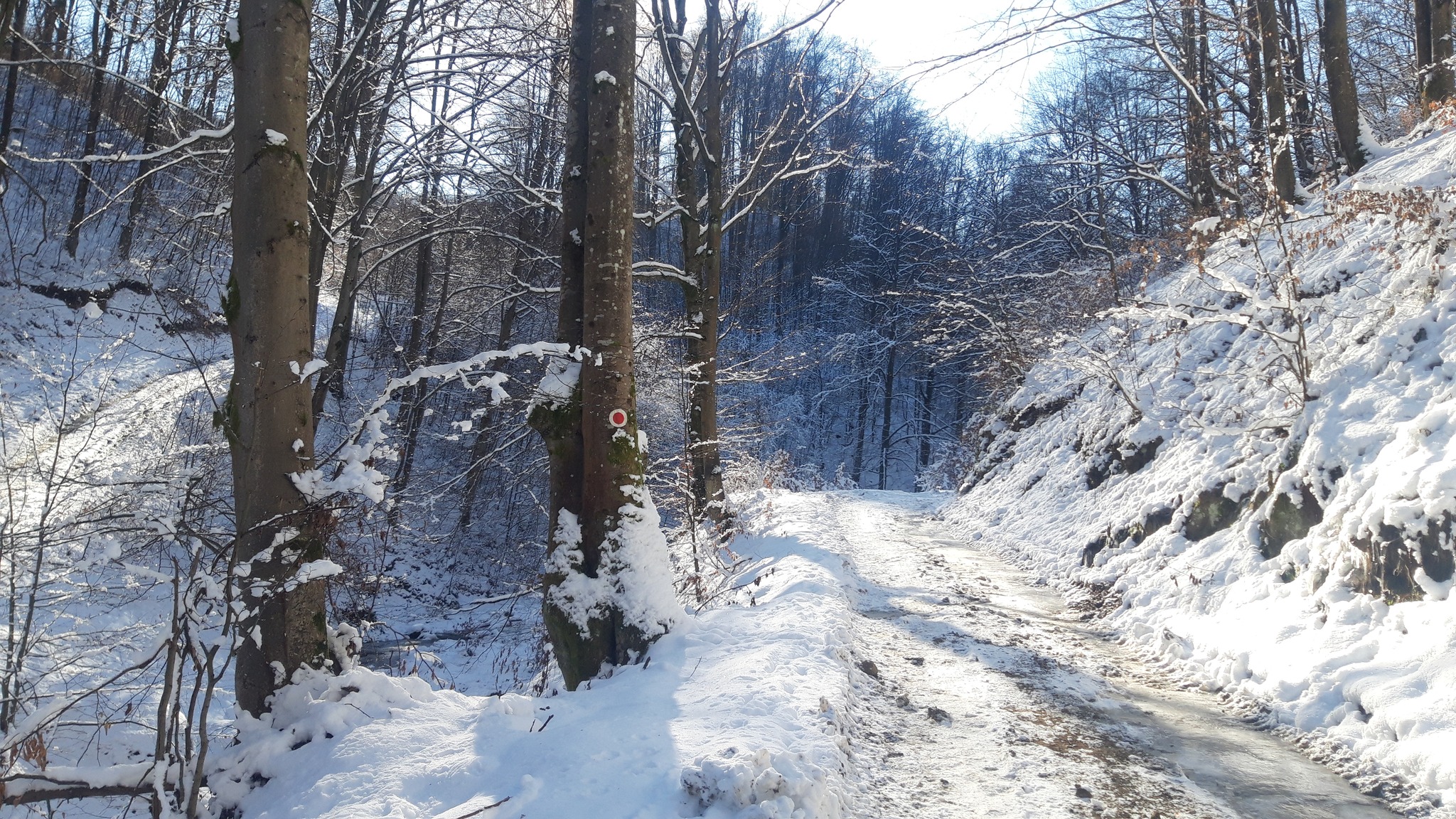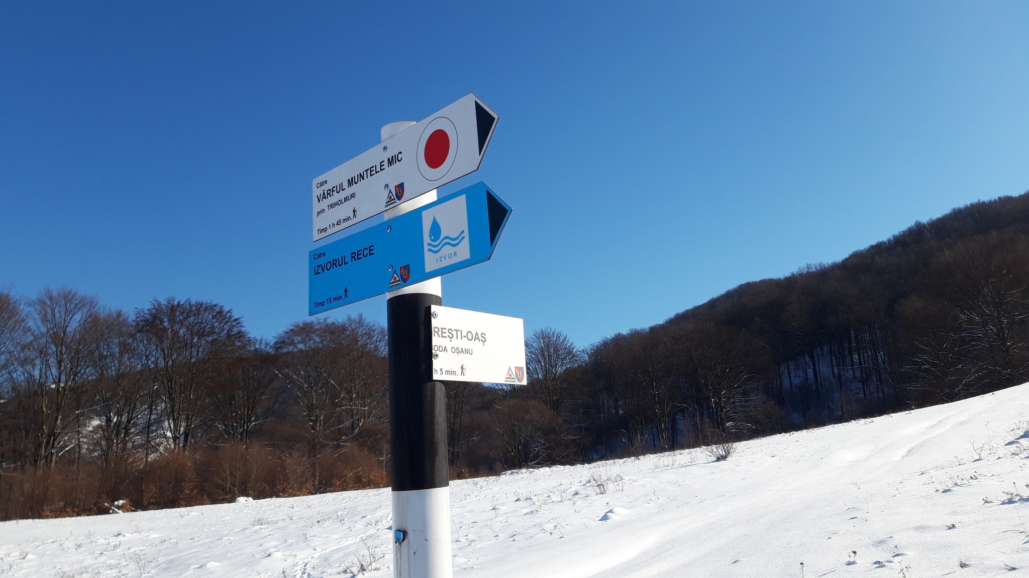 După cca 1 km parcurși în urcare ușoară, vom ajunge pe cresta care separă cele două județe, nu înainte de a fi trecut pe lângă un izvor cu debit bun chiar și pe secetă, izvor care va trebui reamenajat deoarece a fost afectat de lucrările de exploatare a lemnului din această iarnă. O mențiune importantă este aceea că de aici ne putem aproviziona ultima oară cu apă de izvor, altă sursă de apă până pe vârf nu vom mai găsi.