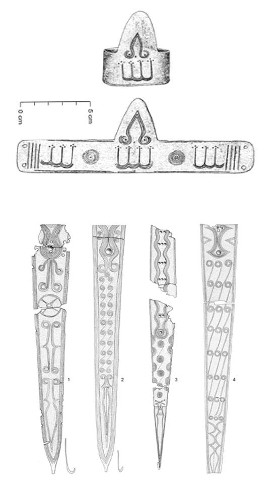 Împreună cu de alte evidențe arheologice – motivul ce copiază halebardele de aur, văzute ca obiecte de prestigiu (sau de cult ?) – pune problema existenţei unor mituri sau credinţe referitoare la vechile arme/ săbii magice. Aceste mituri, reflectate de poemele homerice, legendele celtice şi scandinave sau povestirile despre sciţi, apar ca având o largă răspândire în vechea Europă sau în Orientul Apropiat (unde sunt documentate în scris încă din mileniul II a Chr). Ele sunt fragmente ale mitologiei şi ale ideologiei vechilor caste de războinici, care se reflectă într-o manieră splendidă şi în rigoarea motivelor decorative de pe armele din preistoria spațiului carpatic (stilul Apa-Zajta). Din această perspectivă trebuie remarcată asemănarea dintre reprezentările antropomorfe de pe toporul de aur de la Țufalău cu șirul de linii ce au puncte la capete, motiv prezent pe spada de la Livada. Acest motiv, redat într-o manieră mai expresivă pe alte arme trimite spre un șir de reprezentări antropomorfe. Acestea, în acord cu ideologia vremii, ar putea simboliza o înșiruire de personaje, o comunitate pe care războinicul/ căpetenia a simțit nevoia să o aibă reprezentată pe arma sa emblematică. Cu aceste arme războinicii îşi apărau viaţa lor şi salvau viața semenilor, luptau pentru a proteja sau câștiga averi, cu tăișul sabiei își apărau onoarea sau dobândeau prestigiu, impuneau respect.