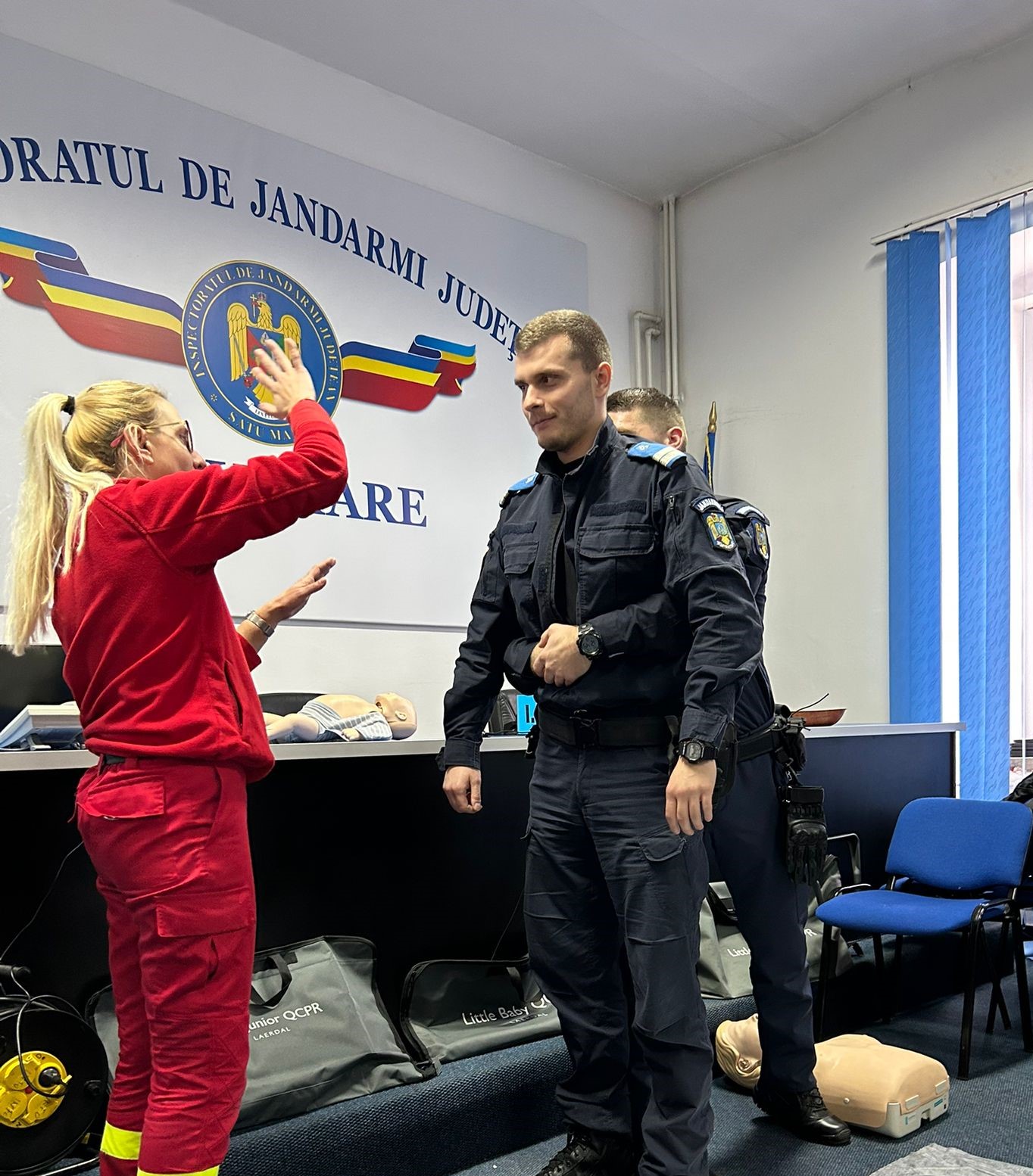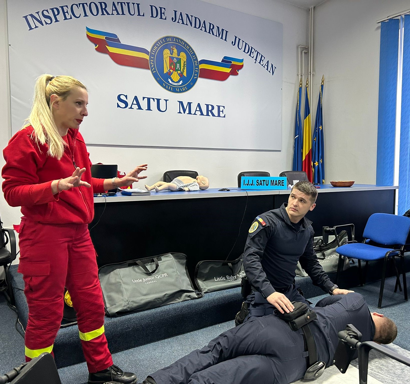 Doamna plt.adj. Ramona Ardelean – coordonator SMURD Satu Mare i-a instruit pe jandarmii sătmăreni și le-a oferit informații de bază despre modul de acțiune în situații care să necesite prim ajutor imediat.