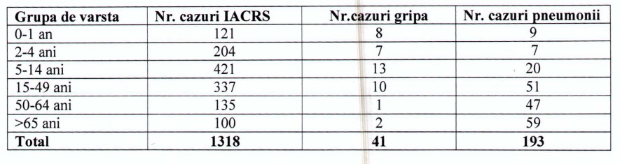 Saptamana 20.03.2023- 26.03.2023(S12/2023) - La nivelul judetului, numarul total de cazuri de infectii respiratorii acute ( IACRS, pneumonii si gripe) a fost de 1318 , comparativ cu 1051, inregistrate in saptamana precedenta. - Lipsa de activitate gripala la nivelul judetului. - Pana la data de 28.03.2023 au fost vaccinate antigripal 17450 persoane din grupele la risc, cu vaccin distribuit de Ministerul Sanatatii.