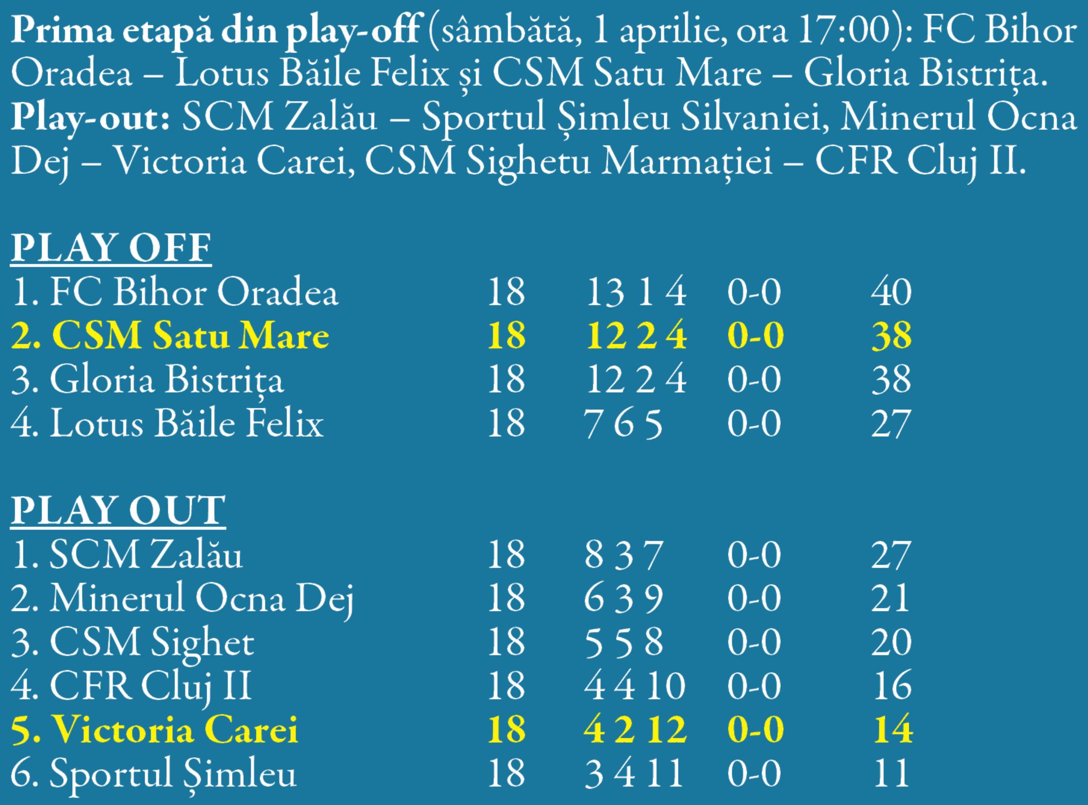 La finalul acestei săptămâni încep bătăliile din play off și play out-ul ligii a 3-a. În seria a 10 cele două reprezentante ale județului, CSM Olimpia Satu Mare și Victoria Carei pornesc cu obiective diferite și în grupe diferite.